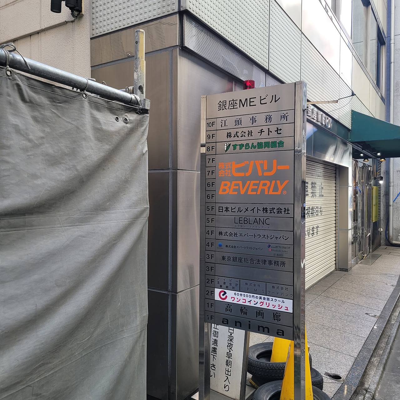어쩌다보니 옆에 있는 건물(銀座MEビル)의 층 사진을 찍은 듯 하다. '나중에 무슨 내용인지 한 번 봐야지'하고 찍어둔 것이겠지만 이제야 봐 본다. 건물 2층에는 60분에 500엔을 내면 되는 영어 회화 스쿨과 법률회계 사무소, 주식회사가 있었군. 3층과 4층도 비슷한 듯 하고. 5층에는 LEBLANC 파인아트 (ファインアート)라고 쓰여 있고, 이후로도 주식회사와 사무소. 참.. 쓸데없는 정보죠?