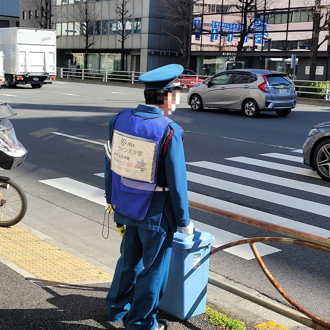 이 분은 여기 앞에서 무엇을 하는 것인지 모르겠는데, 궁금하여 우선 사진을 찍어두었었다. 이제 조사해보니 JRA는 일본중앙경마회 (Japan Racing Association)였고, 그 아래에 쓰인 단어는 WINS (장외발매소) 시오도메 (ウインズ汐留)이며, 발매 및 환불시간 (発売·払戻時間)은 9:20~17:00라고 쓰여 있는 것이었다. 아, 경마의 마권(?) 파는 곳으로 안내하시는 분이었구나. 공무원인 줄 알았네.