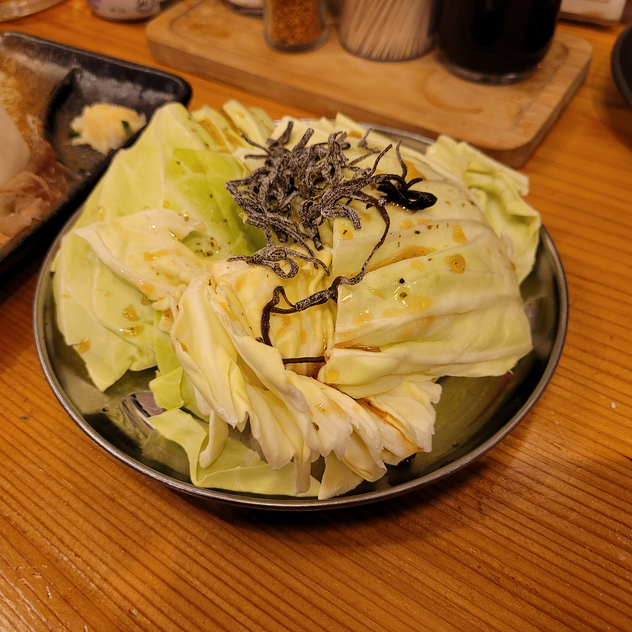 골뱅이 창란젓 (츠부[つぶ] 챵쟈[チャンジャ]): 츠부(つぶ)는 골뱅이(츠부가이[つぶ貝])를 뜻하고, 창자(チャンジャ)는 창난젓을 지칭하는 말이라고 한다. 한국의 창난젓을 일본에 들여올 때 발음이 어려워 창자라는 발음으로 들여왔던 것이 굳어졌다고 한다. 380엔.