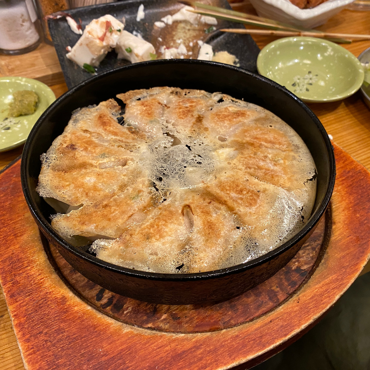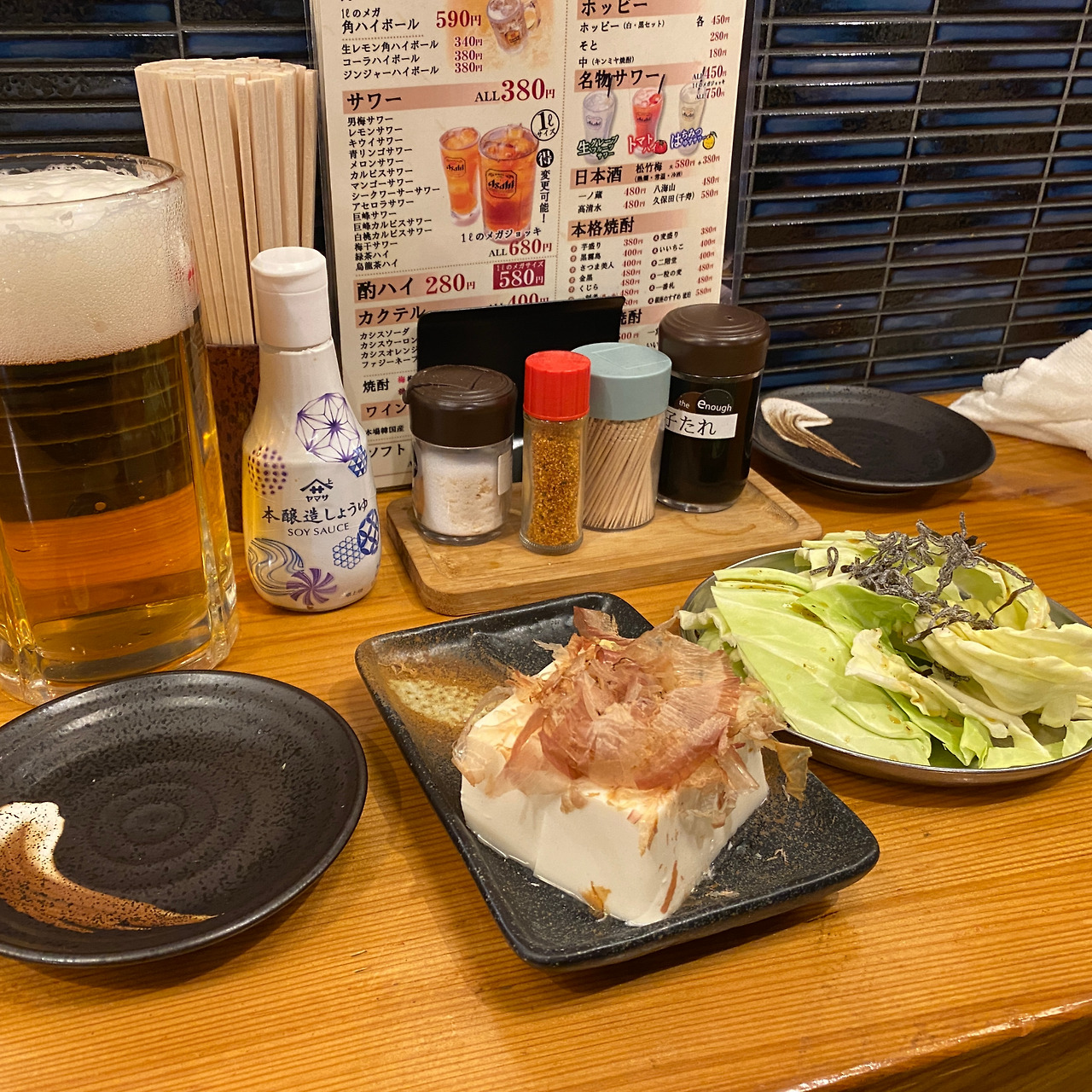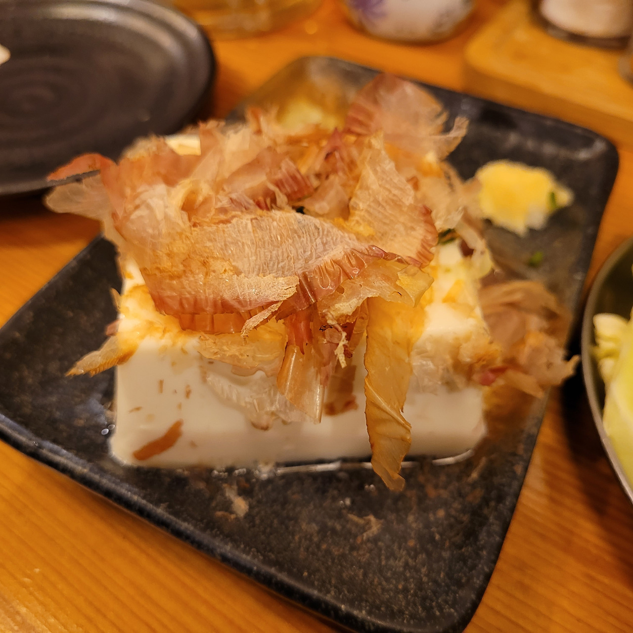 아게다시도후(揚げ出し豆腐; あげだしとうふ): 380엔. 이 메뉴는 한국 이자카야에서도 종종 취급한다. 다시(出し; だし)는 맛국물(다시마·가다랑어포·멸치 등을 끓여 우린 국물)이라는데, 튀긴 두부에 이 국물을 끼얹고 쪽파 등을 올려 먹는 음식으로 보인다.