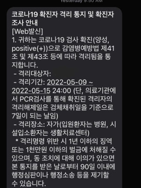 가족들에게 소식을 전한 뒤, 회사에 연락했다. 코로나에 걸리면 일단 격리 해제일까지 유급휴가이다. 오늘 상무님이 마침 출장에서 복귀하시는 날이고, 다음 주에는 중요한 행사가 있는데 마음이 찝찝한 것은 어쩔 수 없다. 그리고 우리 팀원들에게 매우 미안하다. 다들 괜찮다고 하지만, 한참 6월과 8월에 있는 행사로 바쁜 시기인데 도와주지는 못할망정 자리를 비우게 되니 속만 상한다.