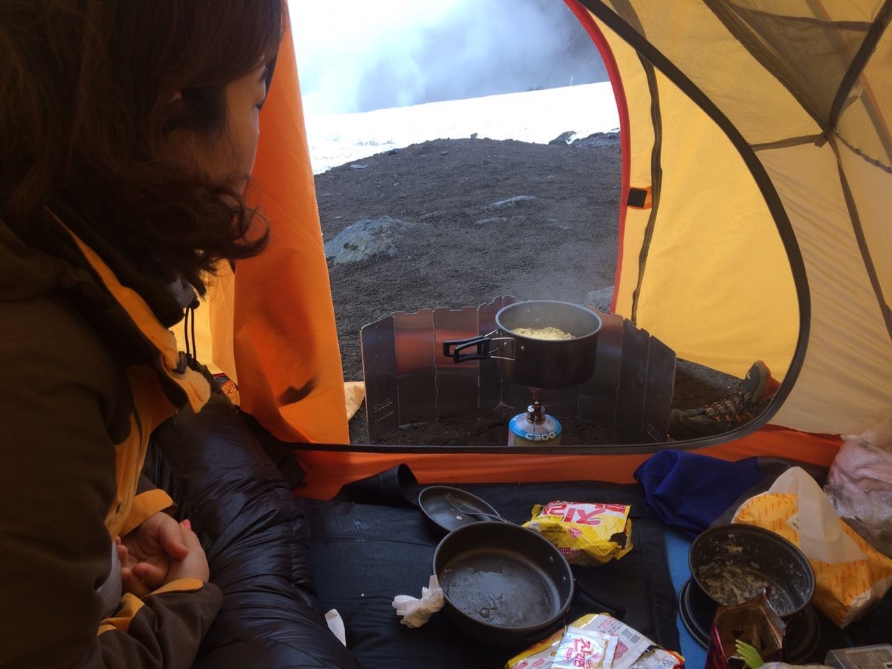 체력소모가 컸던지라 도착하자마자 뜨거운 라면 국물에 밥 말아먹고 텐트를 쳤다.