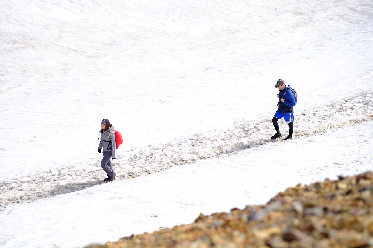 - 첫날 구간은 1,100m까지 올라가는 오르막 구간이고 정상 부근에는 눈으로 뒤덮여 있어
