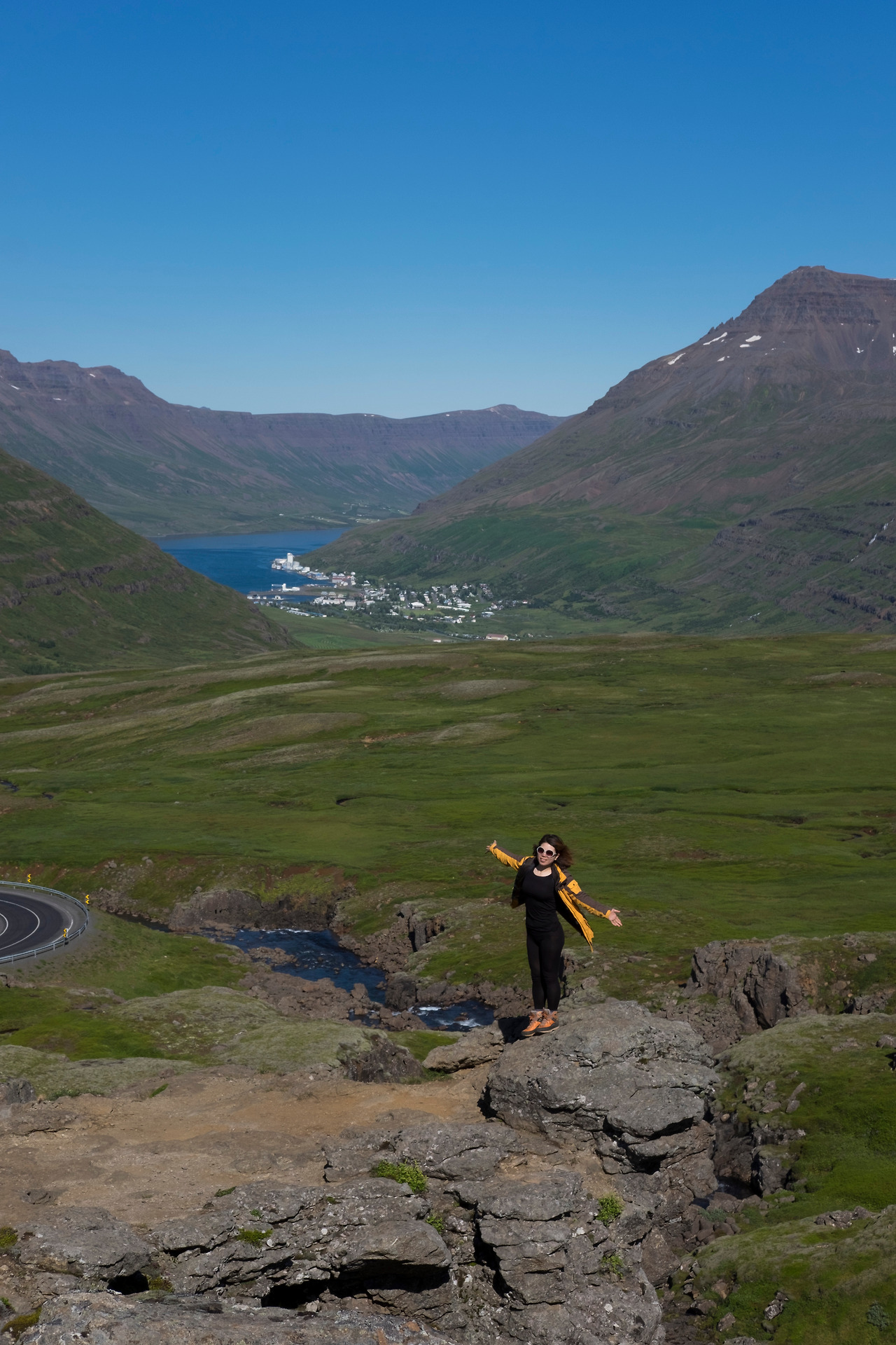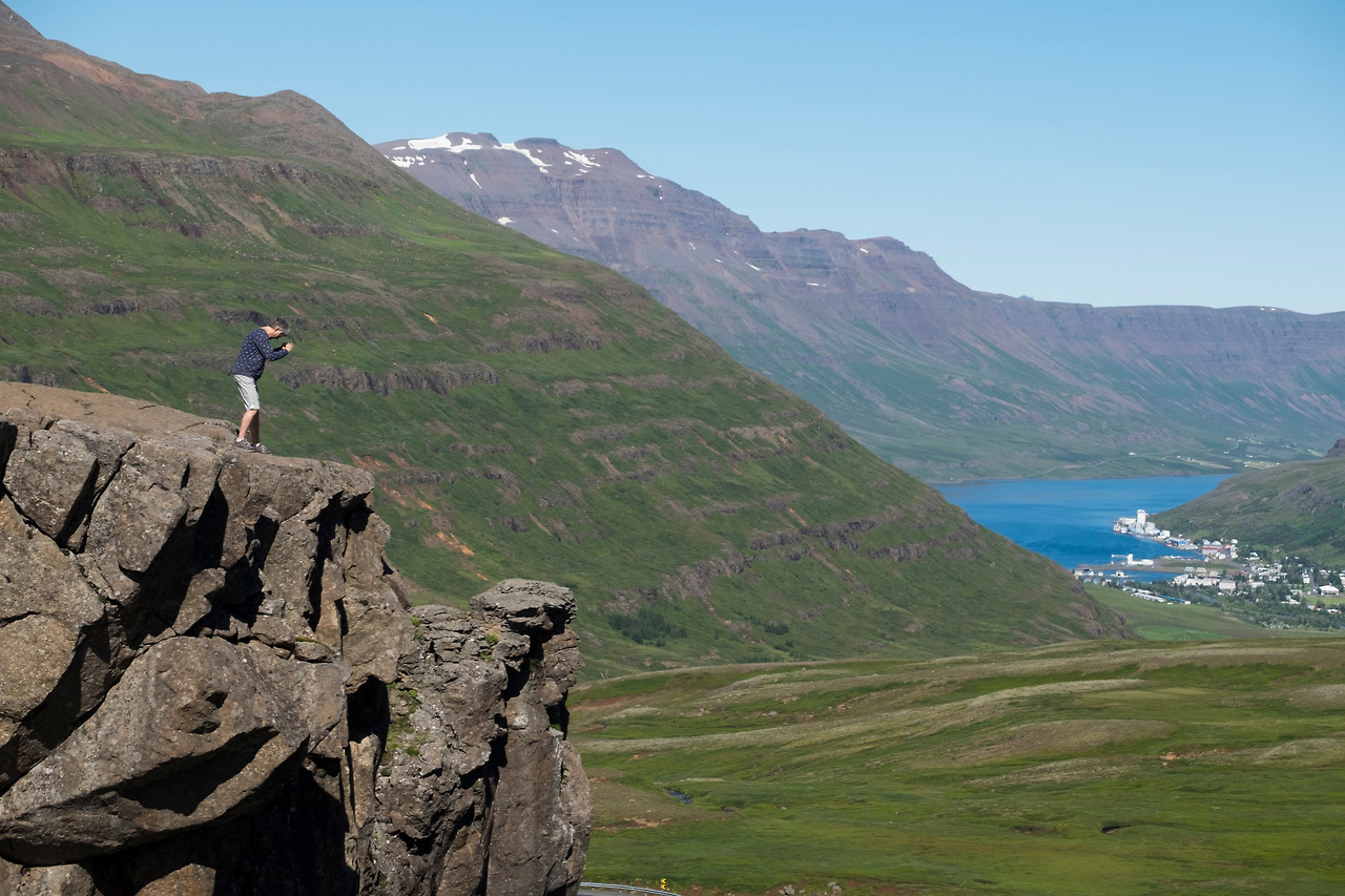 세이디스피오르드의 가장 멋진 장소를 추천한다면 나는 아무래도 영화의 주요 촬영지였던 93번 도로 꼬불꼬불 내리막길의 시작점인 전망대를 추천할 것이다. 이 전망대에서 오르면 세이디스피오르드 주변풍경이 한눈에 드라마틱하게 펼쳐진다. 마을에서 걸어서 2시간 걸리고, 차 타고 올라가면 15분이면 도착할 수 있는데 우리 부부는 아시다시피 돈을 아껴야 하기에 그리고 도보여행이 컨셉이기에 선택의 여지없이 걸어서 올라갔다. 2시간을 땀 흘려 올라간 결과 고생한 보람이 있었다. 전망대에 다다른 우리 눈 앞에 한 폭의 그림 같은 풍경이 펼쳐졌고 시원한 바람은 우리 이마에 송글송글 맺힌 땀을 식혀줬다.