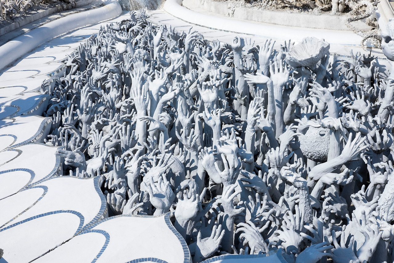 다음날 아침, 치앙라이를 출발하기 앞서 오전에는 치앙라이에 가장 유명한 백색사원을 찾았다. 온통 흰색으로 칠 해져 있어 백색사원 불리는데 이곳 현지 사람들도 '왓룽쿤(백색사원)'이라 불린다. 백색사원은 화려하면서도 세련미가 돋보이고 수많은 거울 조각들이 햇빛에 반짝거려 사원을 더욱더 하얗게 빛내고 있다. 가장 인상적인 것은 백색사원 들어가는 다리 밑에 설치된 조각들인데 지옥에 빠진 인간들이 살려달라며 손을 뻗치는 장면이 가장 인상적이었다. 과연 무엇을 의미하는 걸까? 많은 생각을 하게 한다. 이 백색사원은 치앙라이 출신 예술가인 Chalermchai kositpipat 디자인했다. 흰색 석고와 유리조각을 주재료로 사용했는데 흰색은 부처의 순결을 의미하고, 유리는 부처의 가르침을 상징한다고 한다.