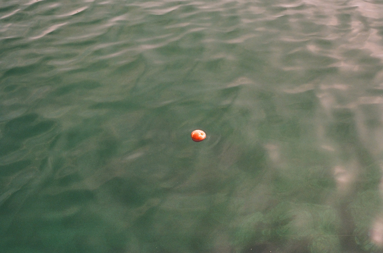 바다 위에 떠 있는 빨간 사과. 빨간 사과, 어쩌다 바다 한가운데를 떠다니니?