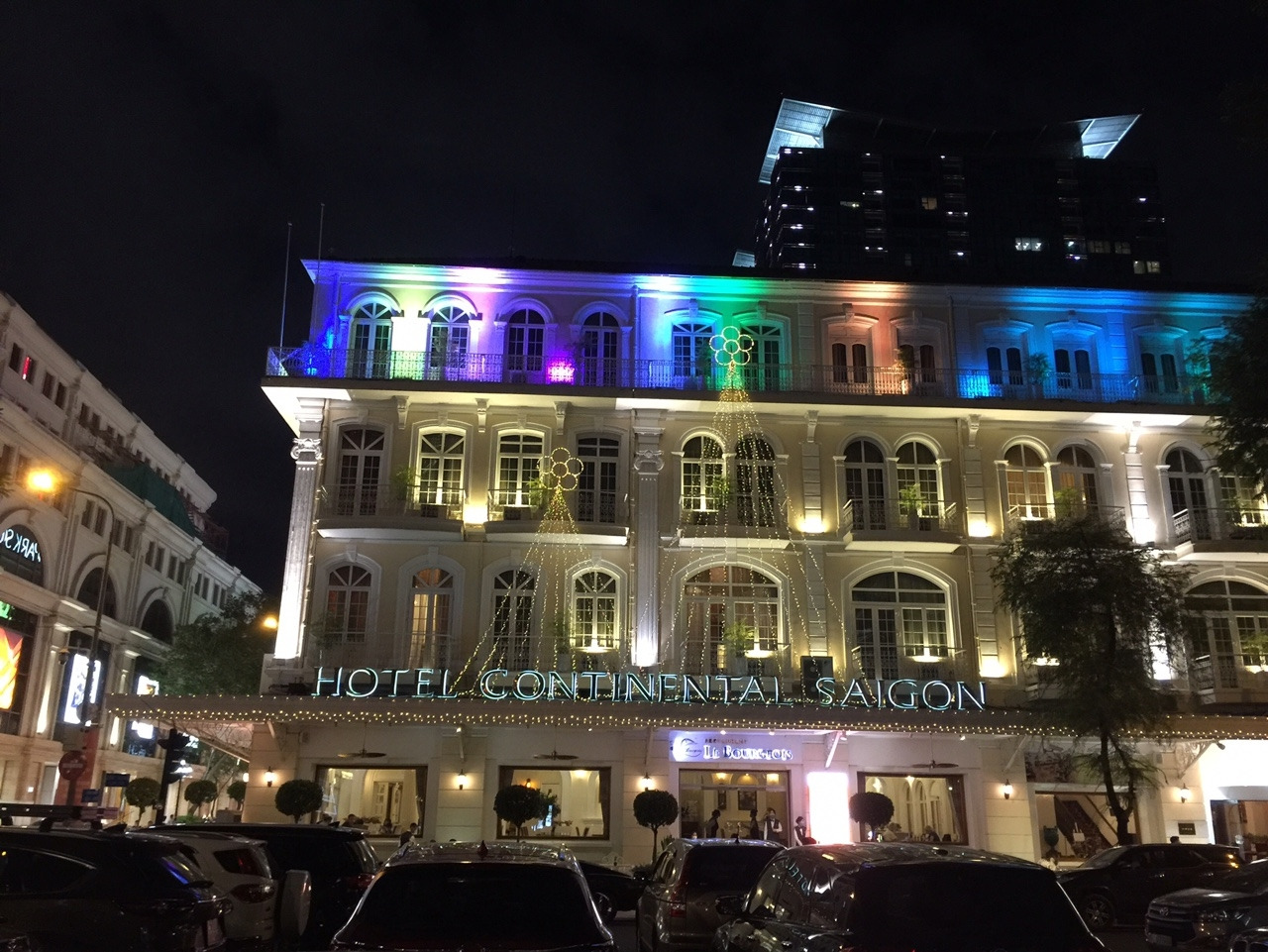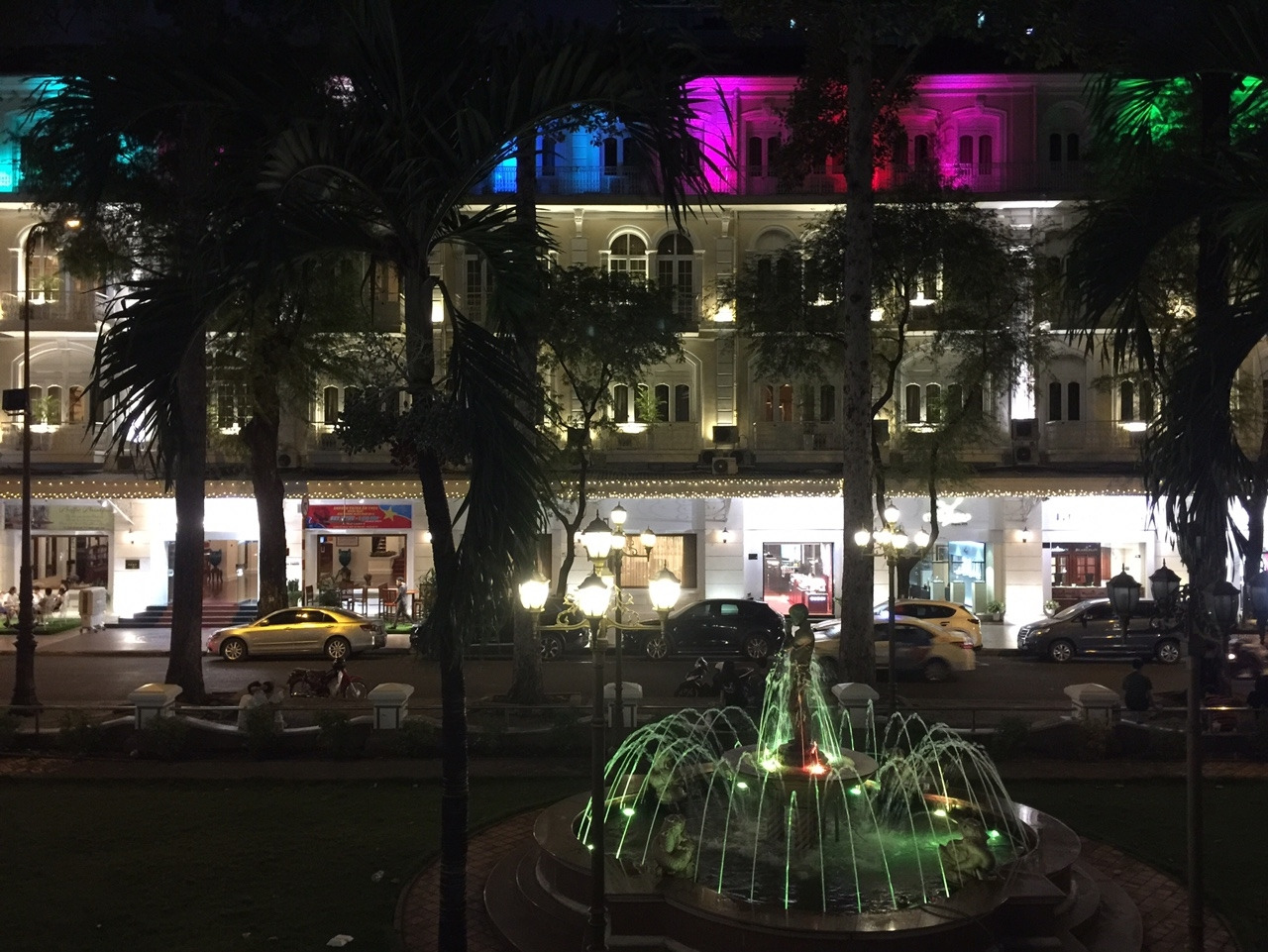 공연 시작 전에는 웰컴 드링크를 준다. 따뜻한 차 한 잔을 받아 들고 발코니로 향했다. 오페라 하우스 측면부의 발코니는 내게 마법의 공간이었다. 그곳에서 바라본 밤 풍경이 너무나 낭만적이었다. 가로등과 조명이 은은하게 비치는 분수대와 정원을 바라보던 그 짧은 몇 분 동안 ‘공연이고 나발이고, 저 풍경 속으로 빠지고 싶군’ 이런 생각이 들었다. 분수대 건너편에서 무지개 색깔 조명을 받으며 빛나는 콘티넨탈 호텔의 모습도 100년 전 사이공 시대로 날 이끌었다.