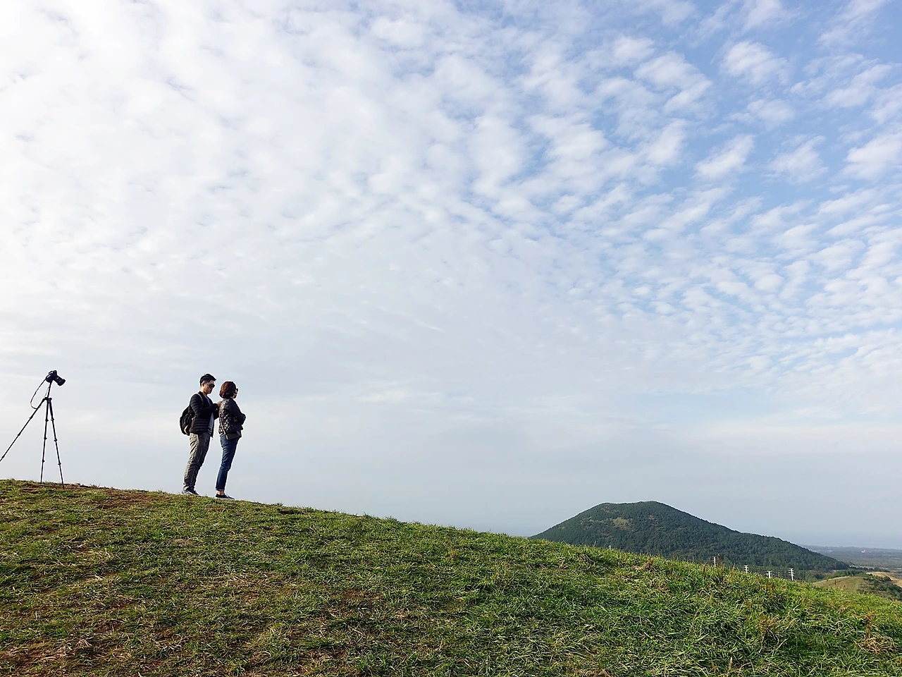 용눈이오름이구나, 알려주지 않아도 알 수 있다. 가을마다 억새꽃이 만발해 사방을 포근하게 감싸는 것으로 유명하니. 마치 용이 누워 있는 모습 같다, 하늘에서 보면 용의 눈을 닮았다 해서 용눈이오름이다. 높이 248m, 백약이오름보다도 낮으니 산책하듯 가볍게 오르면 그만이다. 건너편에는 다랑쉬오름과 아끈다랑쉬오름이 오르는 내내 멋진 풍경을 선물한다. 용눈이오름 자체로도 빼어나다. 세 개의 봉우리가 겹쳐져 형성된 복합 화산체여서, 오를 때마다 또 보는 각도에 따라 능선과 모습이 시시각각 변한다. 2012년 송중기 박보영 주연의 영화 <늑대소년> 촬영지로 알려지면서 더욱 인기를 끌더니 이제는 ‘국민 오름’으로도 불린다.