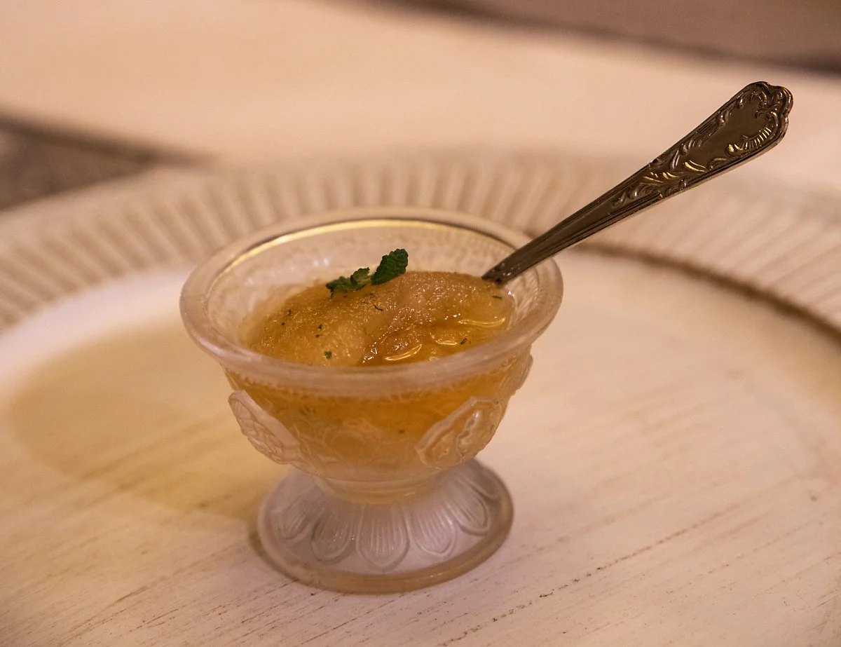 ‘멜랑꼴리’라는 이름을 가진 족발 요리는 제주 멜젓이 카카오와 함께 튀일 형태로 제공됐는데, 콩장이 유일하게 즐기지 못한 제주 멜젓 극복기를 담은 요리였다. 이어서 ‘입가의 미소’가 올라왔다. 유럽에서는 보통 메인 요리를 먹기 전 입가심 요리를 먹는다는 것에 착안한 코스다. ‘입가의 미소’는 제철에 맞는 재료를 가지고 셔벗 형태로 제공이 된다.