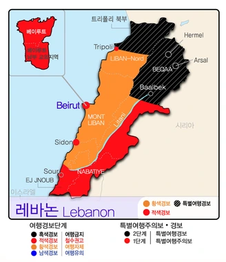위 이미지 (외교부 여행경보 지역 표시)에서 보이듯 여행금지와 철수 권고에 해당하는 흑색/적색경보는 레바논 외곽과 베이루트에 표시되어 있습니다. 기본적으로는 종교의 문제가 바탕에 있겠지만, 시리아와 이스라엘의 이해관계와 해결되지 못한 제국주의의 잔재가 또 다른 원인이 아닐까 싶네요.
