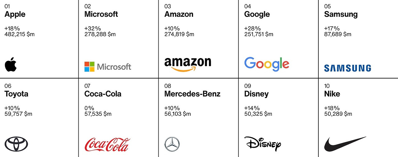 인터브랜드가 산출한 자료를 보면 이런 브랜드의 가치는 많게는 수천억 달러입니다. 아래의 표를 보죠. 1위인 애플의 브랜드 가치는 무려 4,822억 달러, 우리 돈으로 638조가 넘습니다. 2023년 대한민국 1년 예산이 639조이니 대략 감이 잡히시죠?