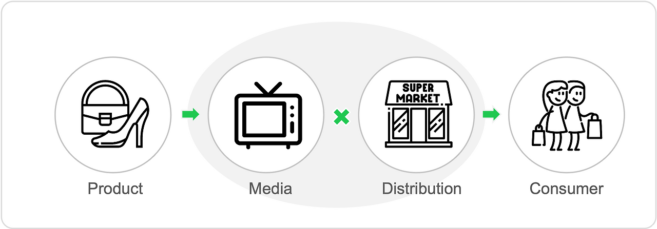 과거의 브랜딩/마케팅을 위한 조건. 소비자와 직접 연결이 안 돼서 중간 과정이 복잡하다.