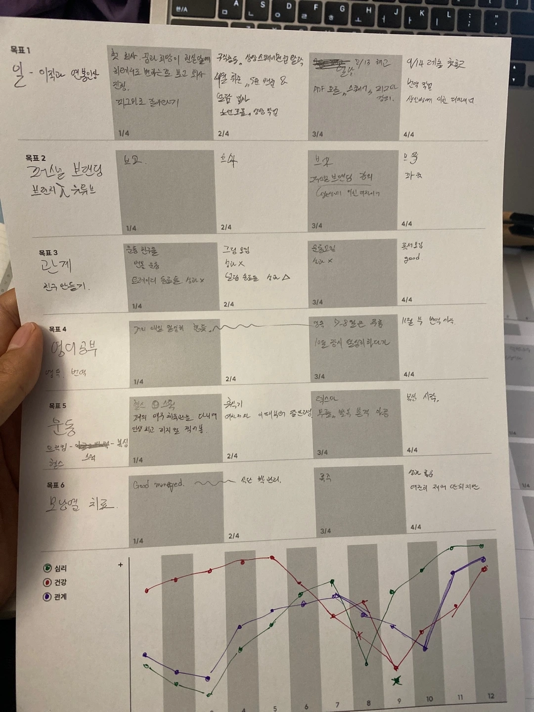 이 회고문을 쓰기 위해 한 해를 돌아보는 매트릭스 정리표를 디자인하고 우리 독서모임 <로운>과 작성하는 시간을 가졌다. 사진의 정리표가 궁금하고 해보고 싶은 분은 이전 글인 ‘새해엔 사이좋게 둘러앉아 계획을 세워봅시다’에서 사용법을 확인하고 양식을 받아가시길 바란다.