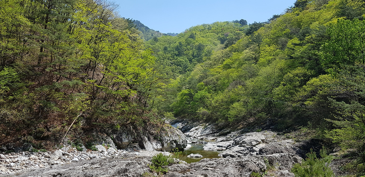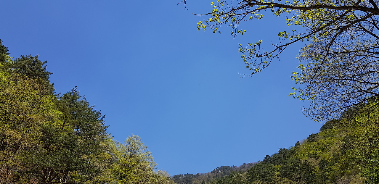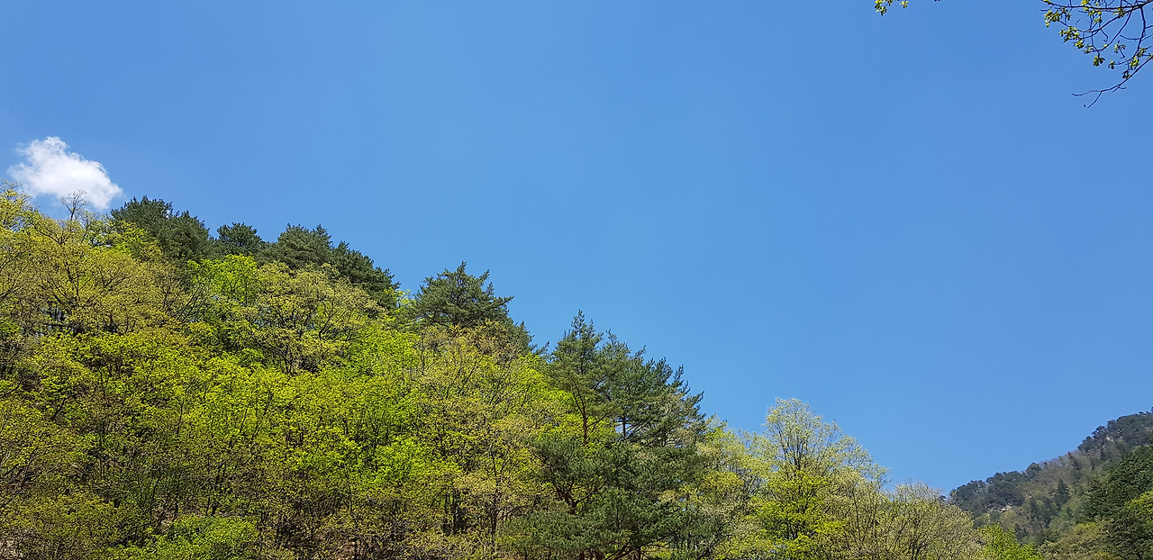 새소리와 물소리가 들리고 푸른 하늘 위로 구름이 지나간다.