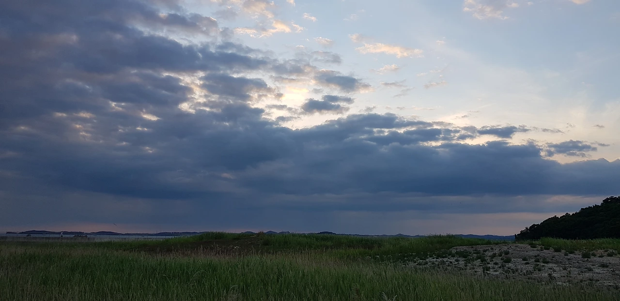 습지 위로 빛을 품은 구름이 몰려온다.
