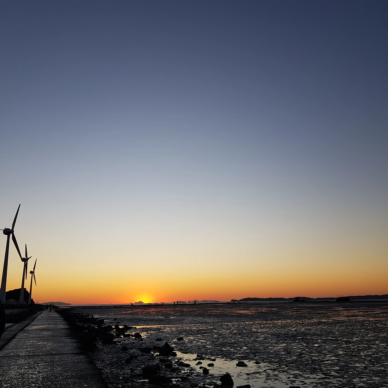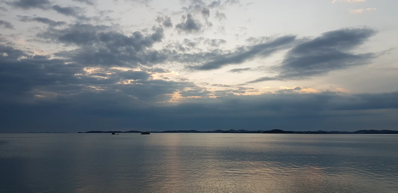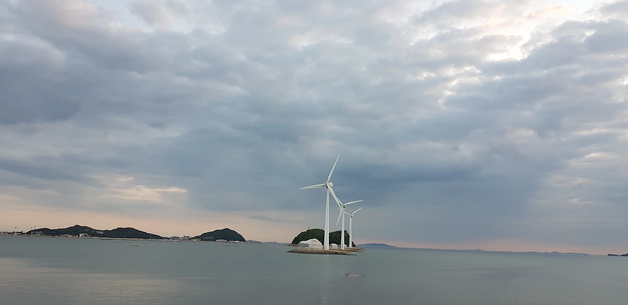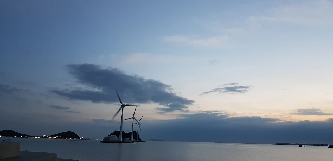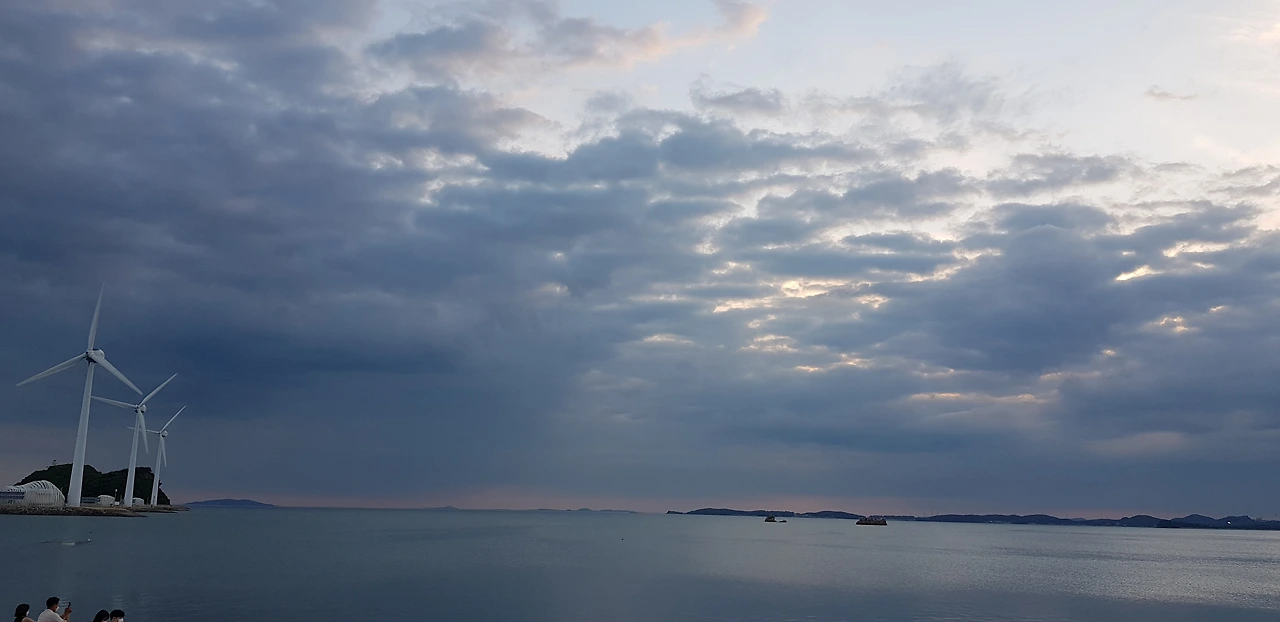 저 멀리 풍력발전기 그림같이 돌아간다. 바다 위 하늘은 구름으로 가득 차 있다.