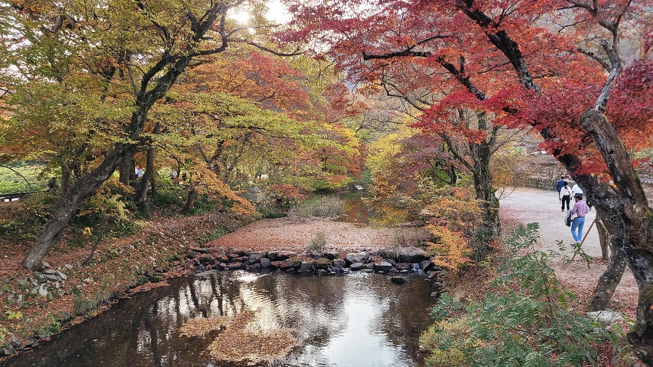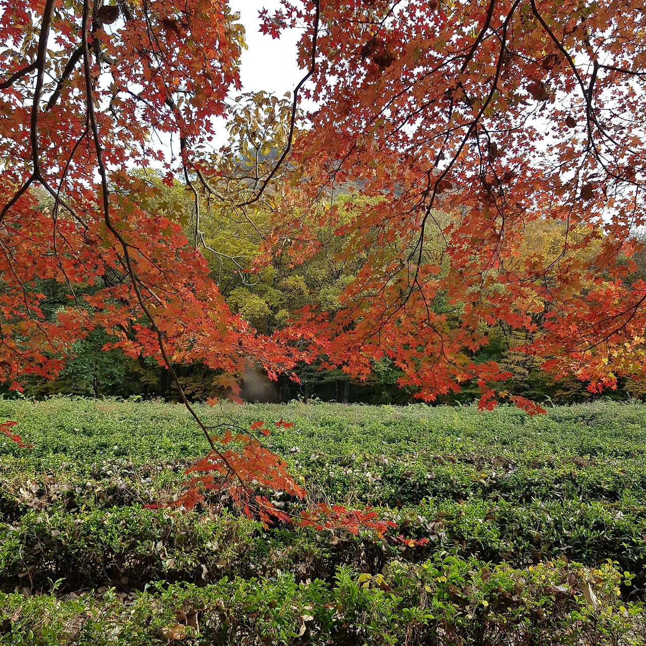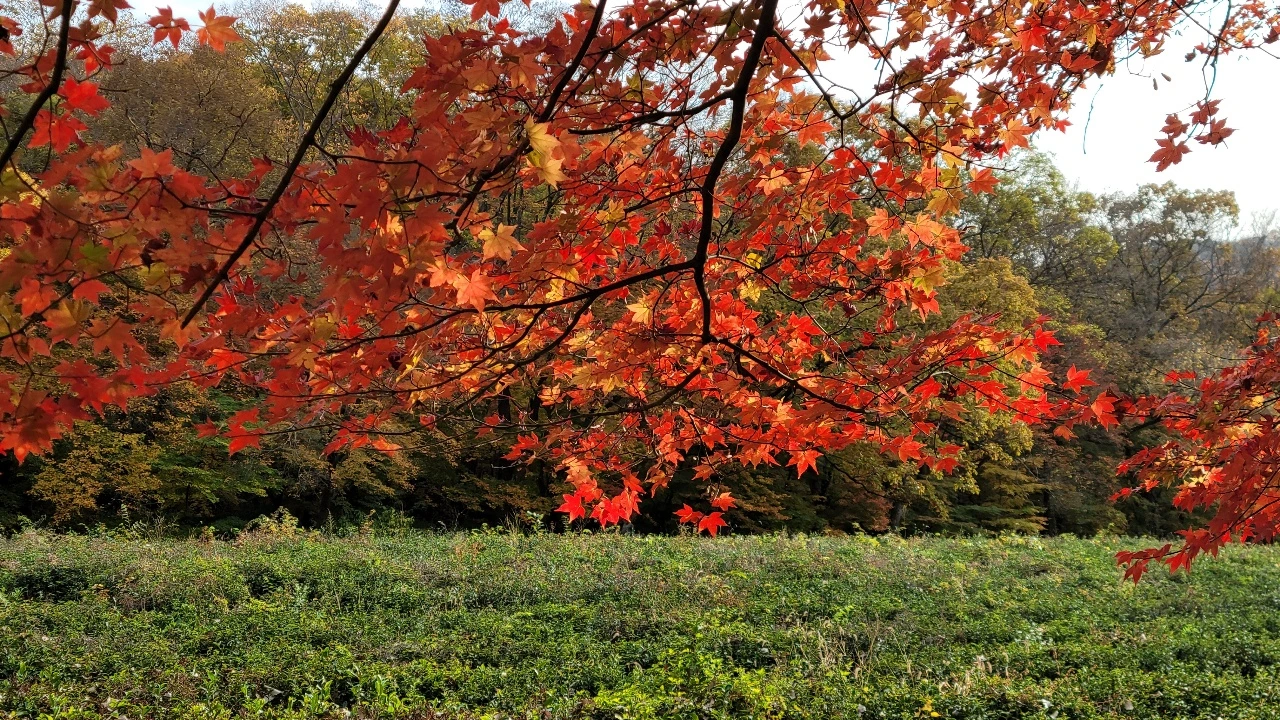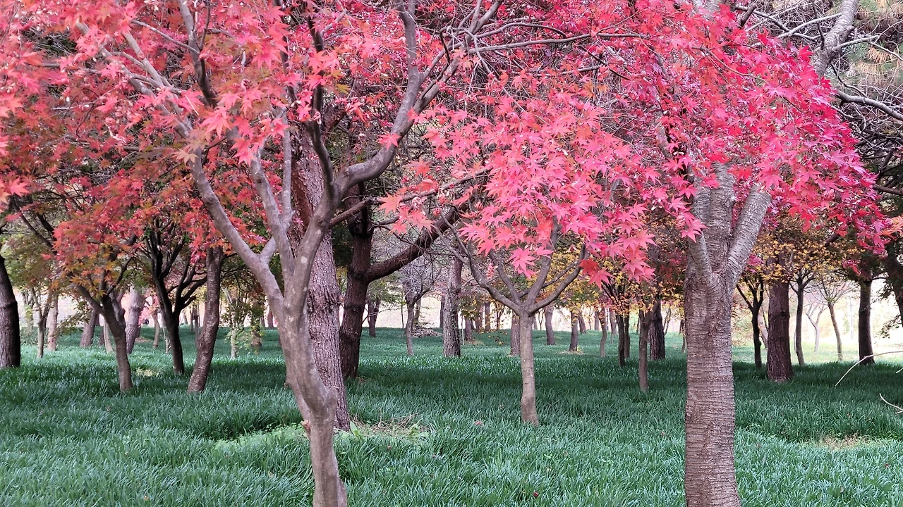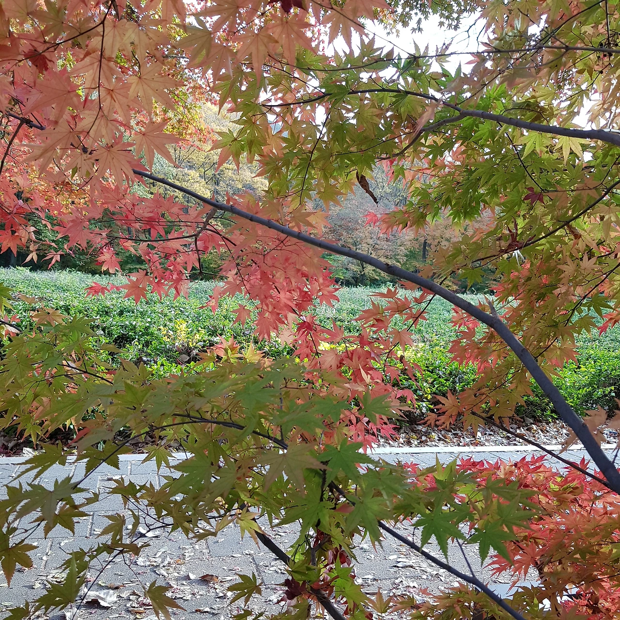 붉은 단풍 아래 초록색 수선화 밭이 인상적이었다.