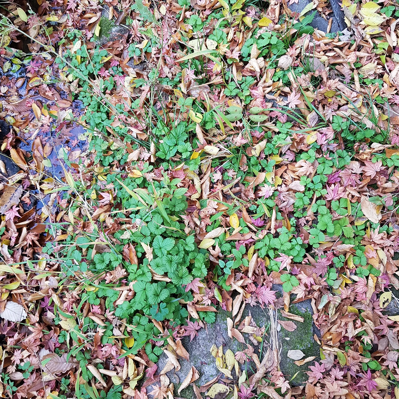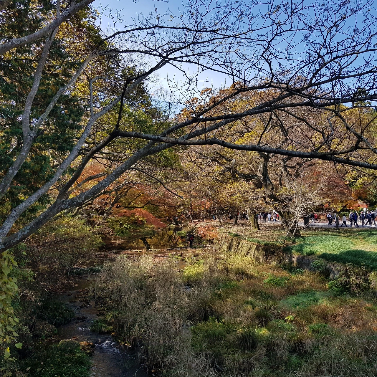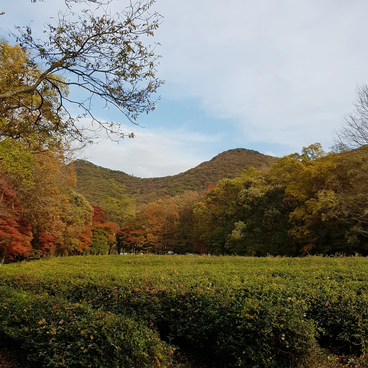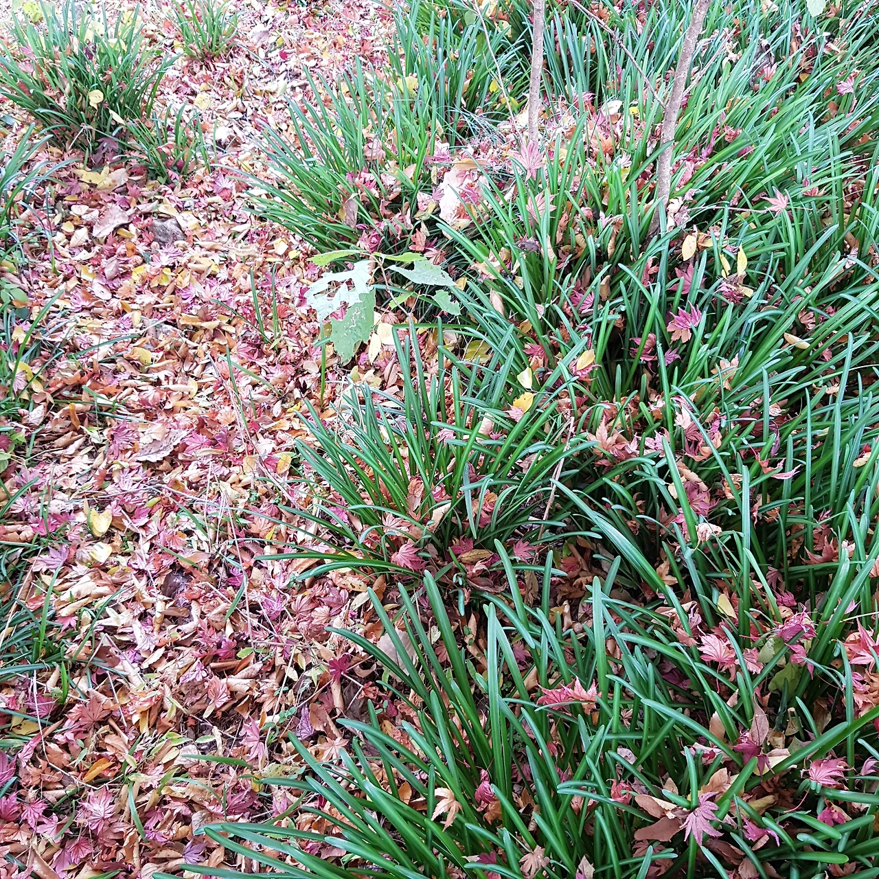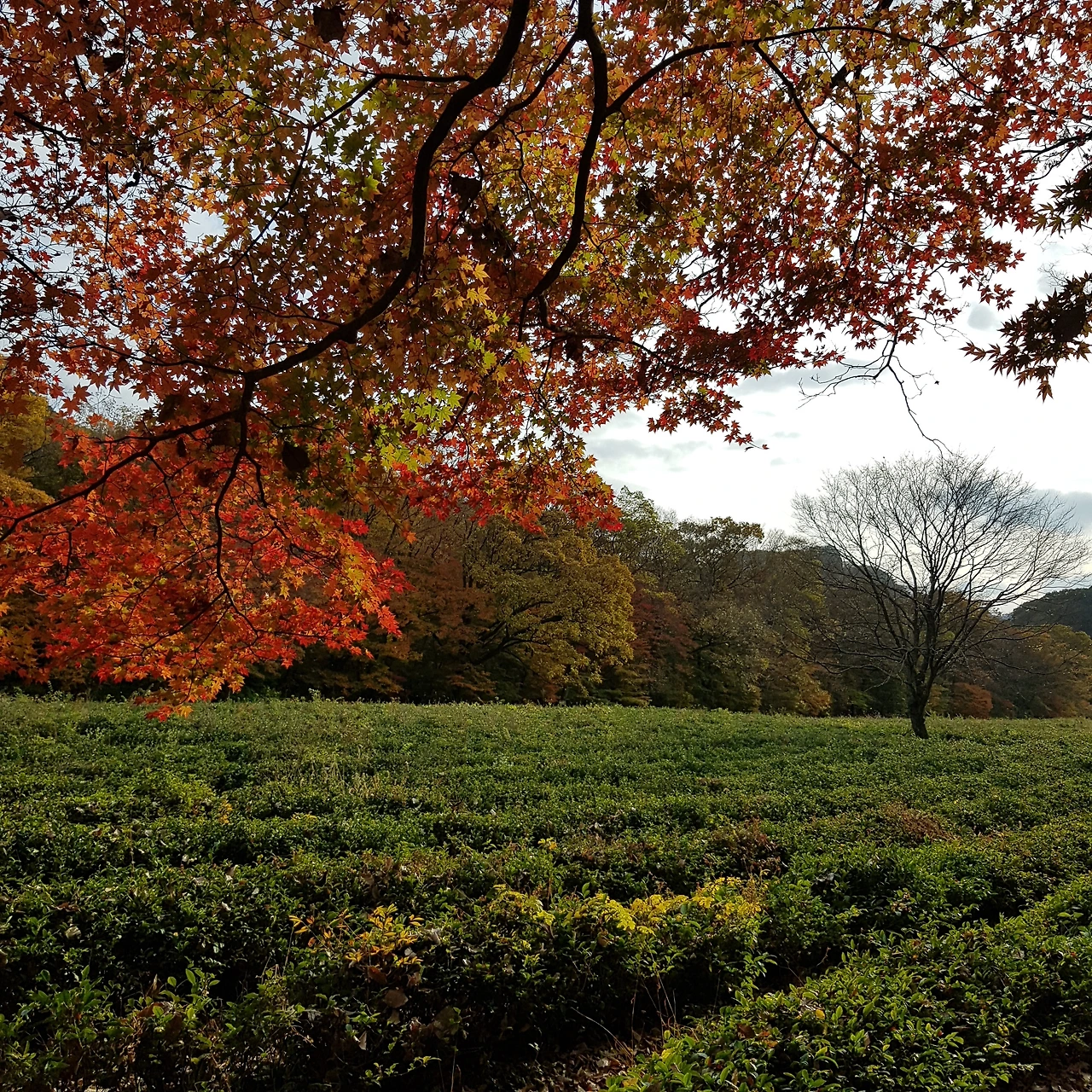 붉은 단풍 아래 초록색 수선화 밭이 인상적이었다.