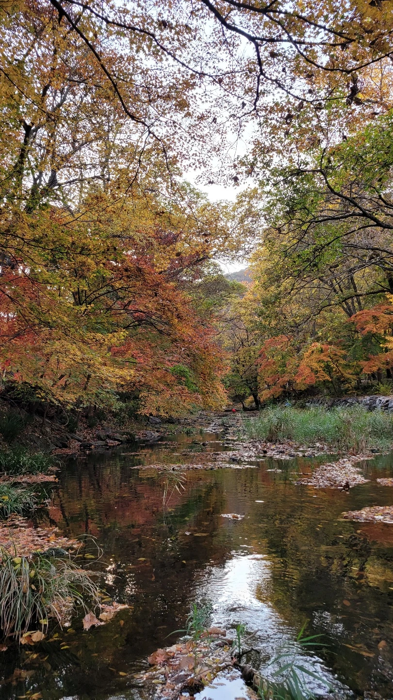 가을 숲 맑은 물에 하늘과 나무와 사람들의 눈길이 머문다.