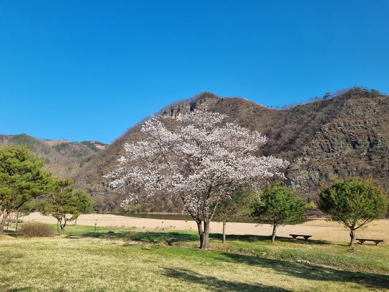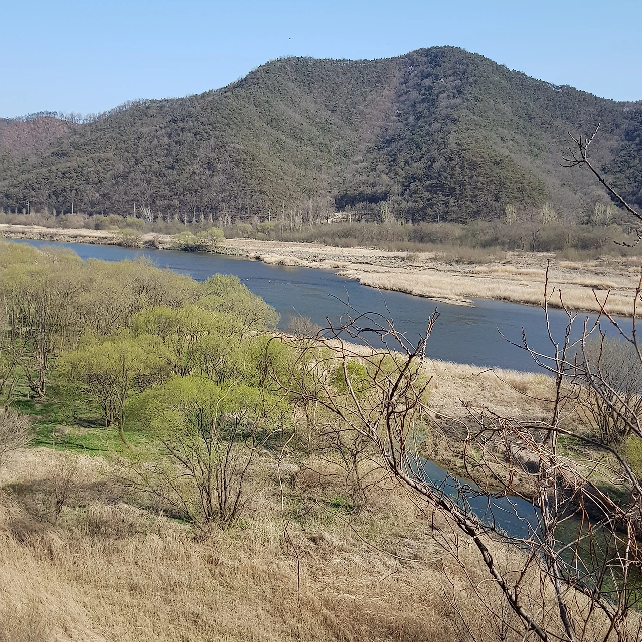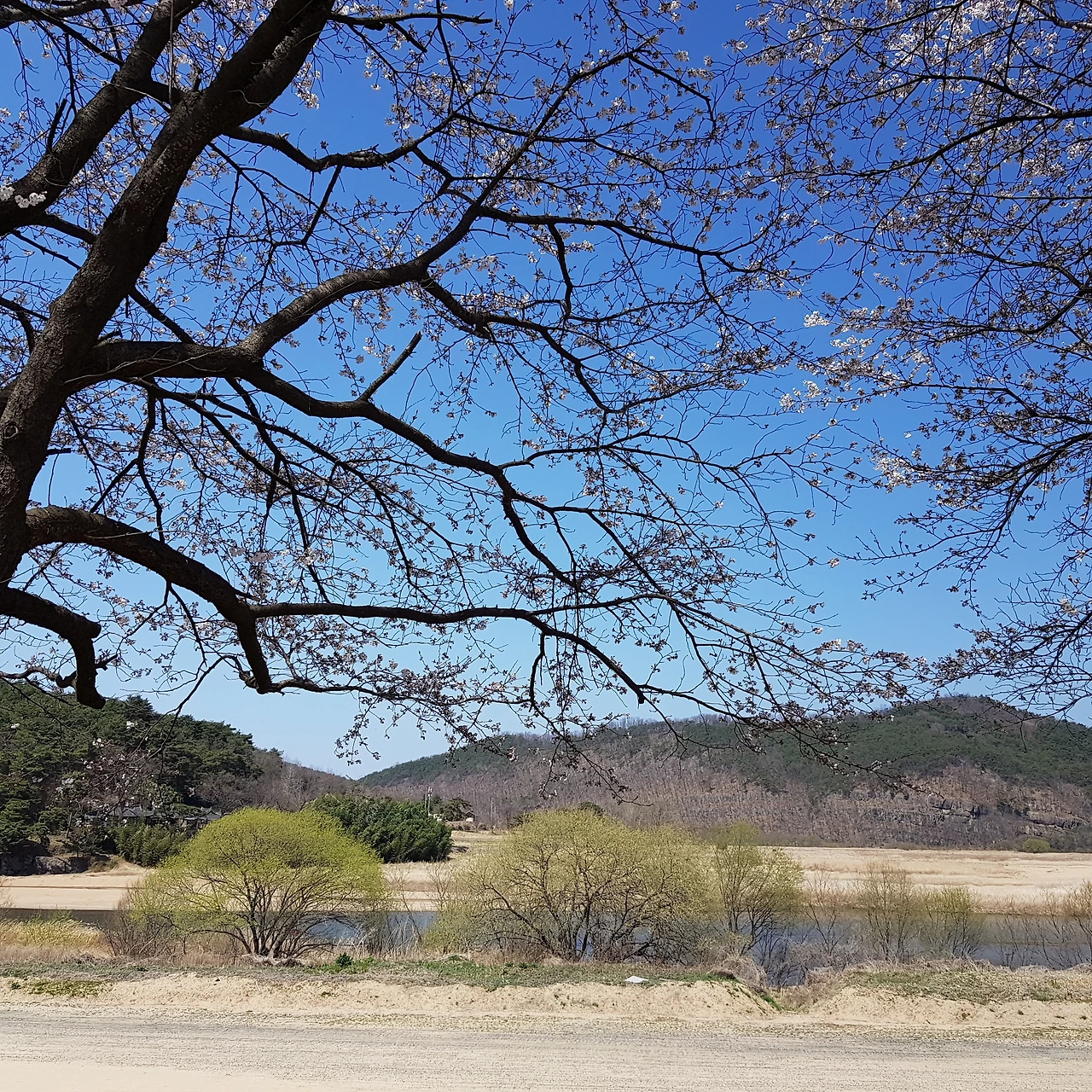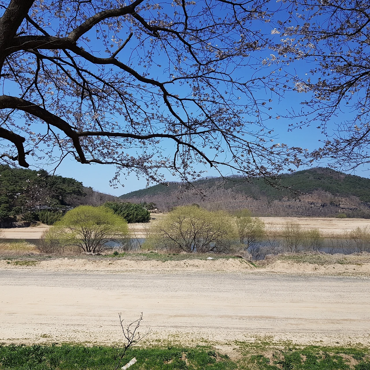 비가 오지 않아 강에는 물이 적었지만 연두색으로 살아나는 물가의 나무들이 하늘의 색과 벚꽃나무 가지와 어우러져 풍경화가 되었다.