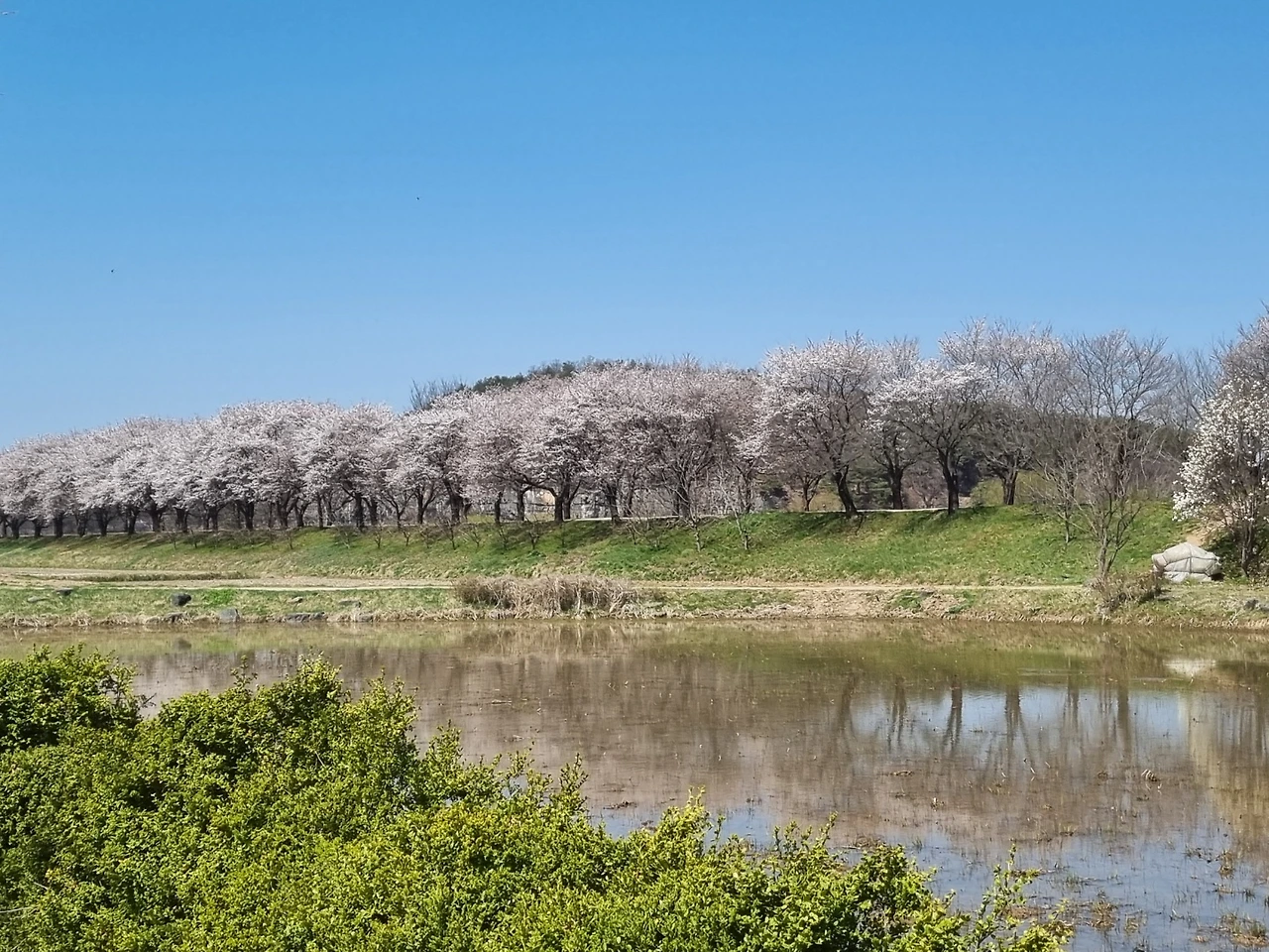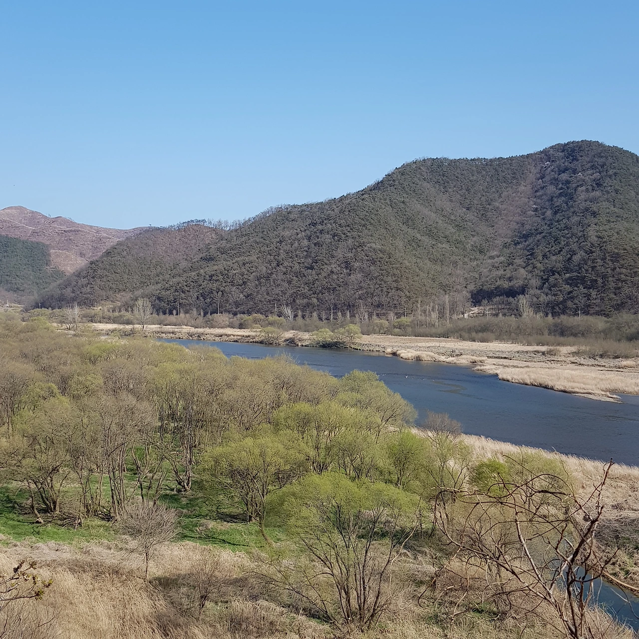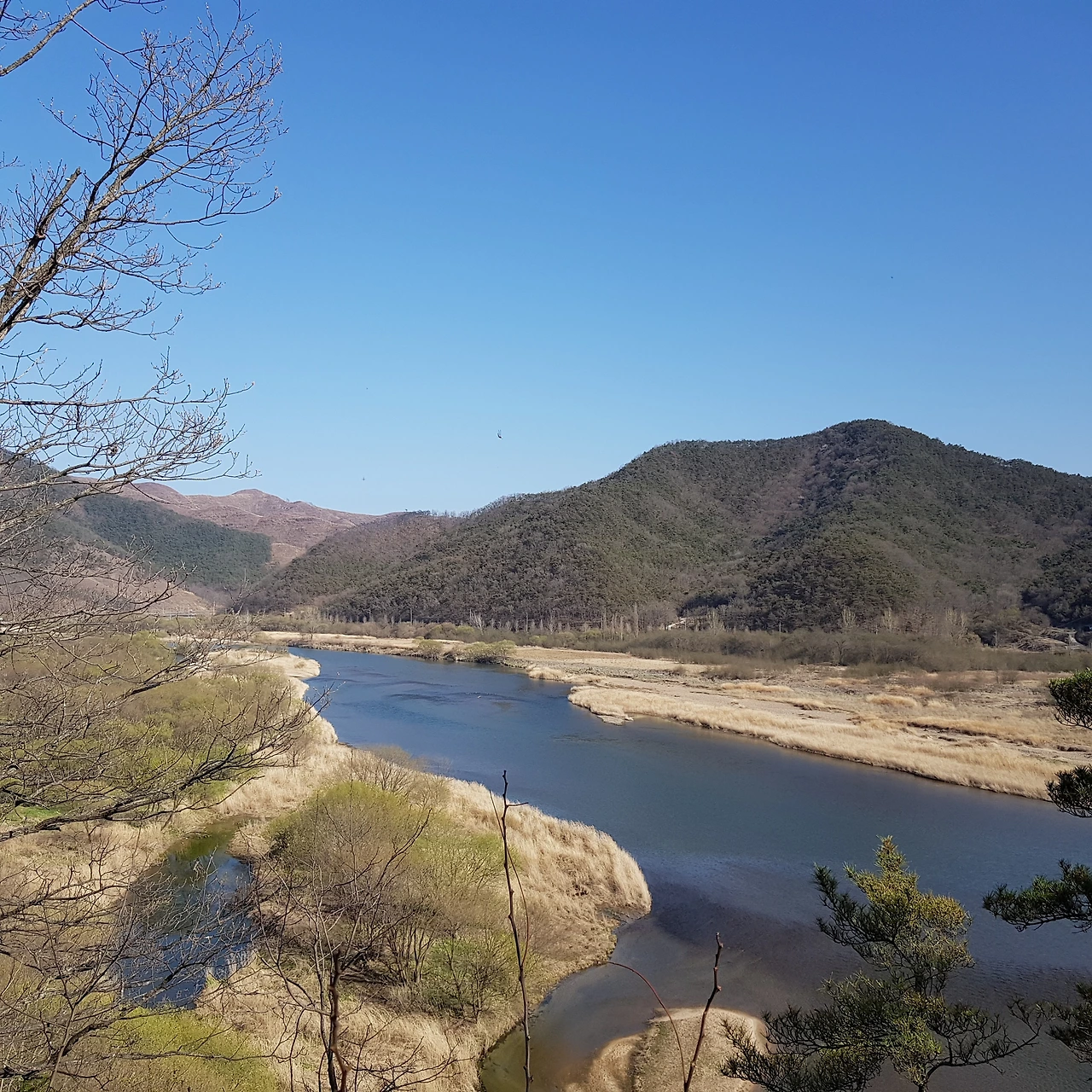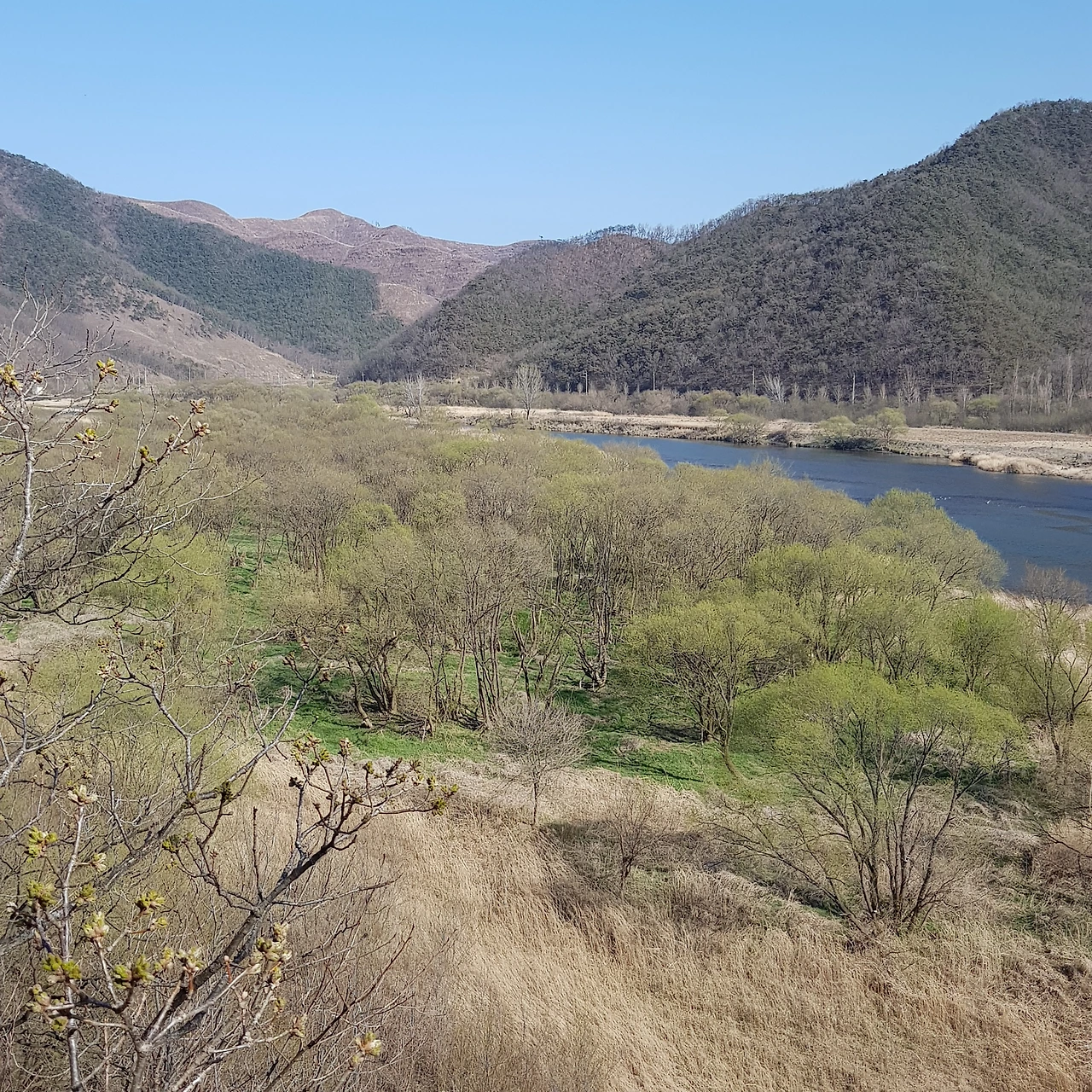 비가 오지 않아 강에는 물이 적었지만 연두색으로 살아나는 물가의 나무들이 하늘의 색과 벚꽃나무 가지와 어우러져 풍경화가 되었다.