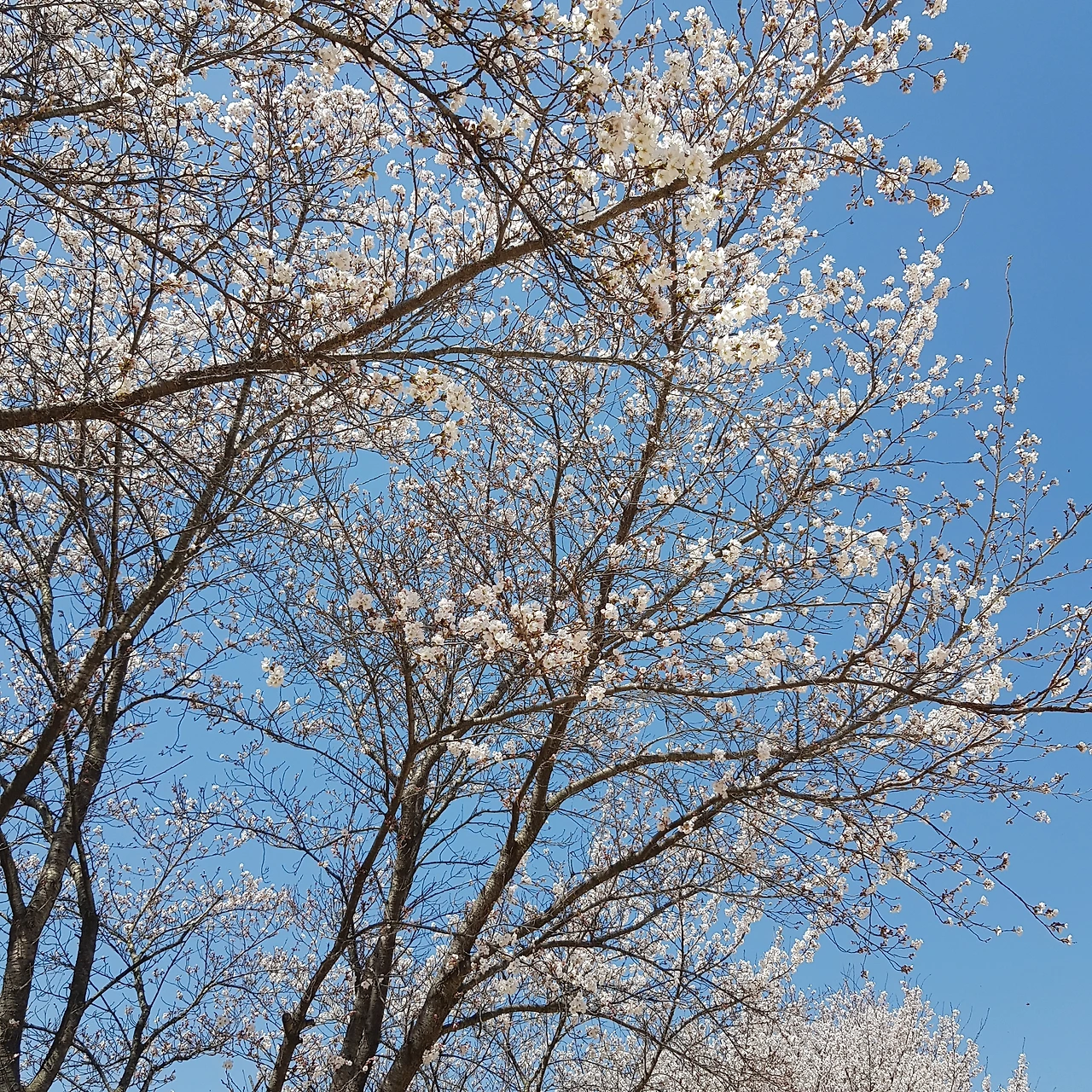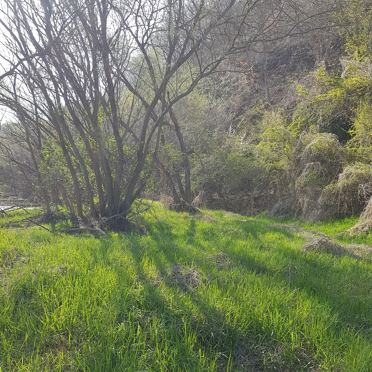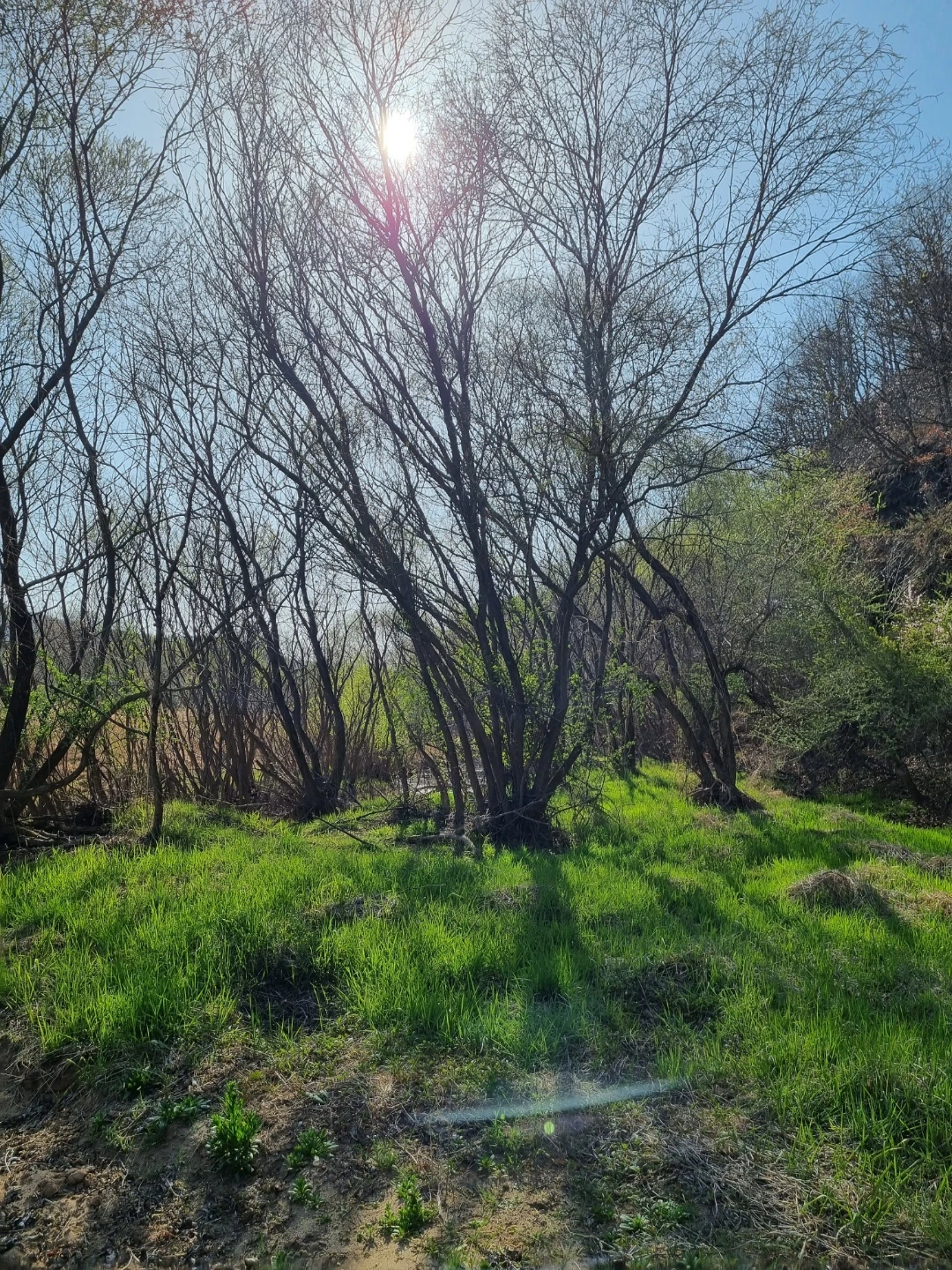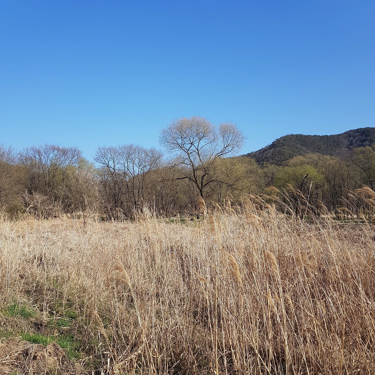 비가 오지 않아 강에는 물이 적었지만 연두색으로 살아나는 물가의 나무들이 하늘의 색과 벚꽃나무 가지와 어우러져 풍경화가 되었다.