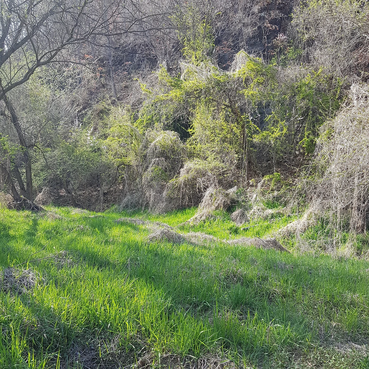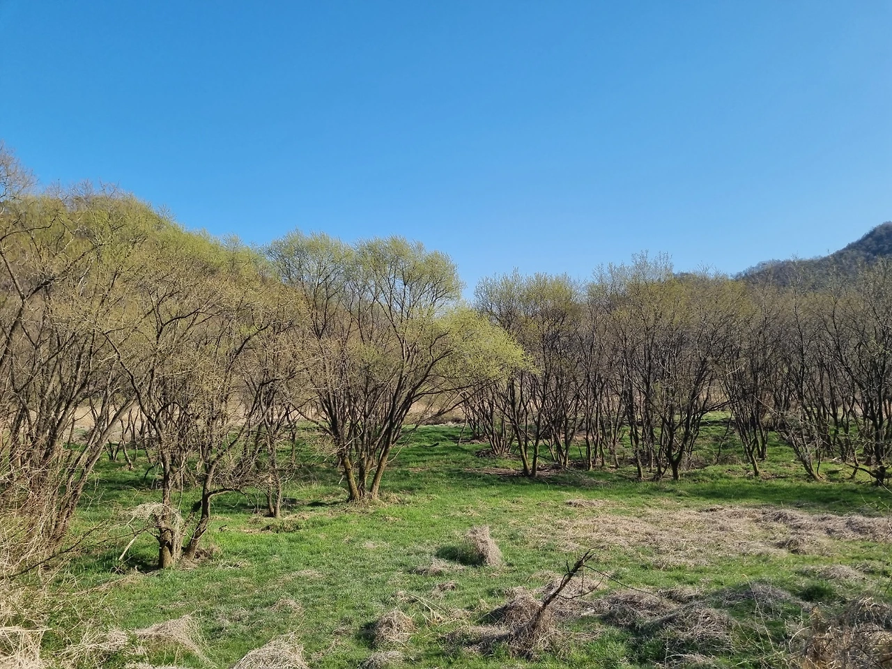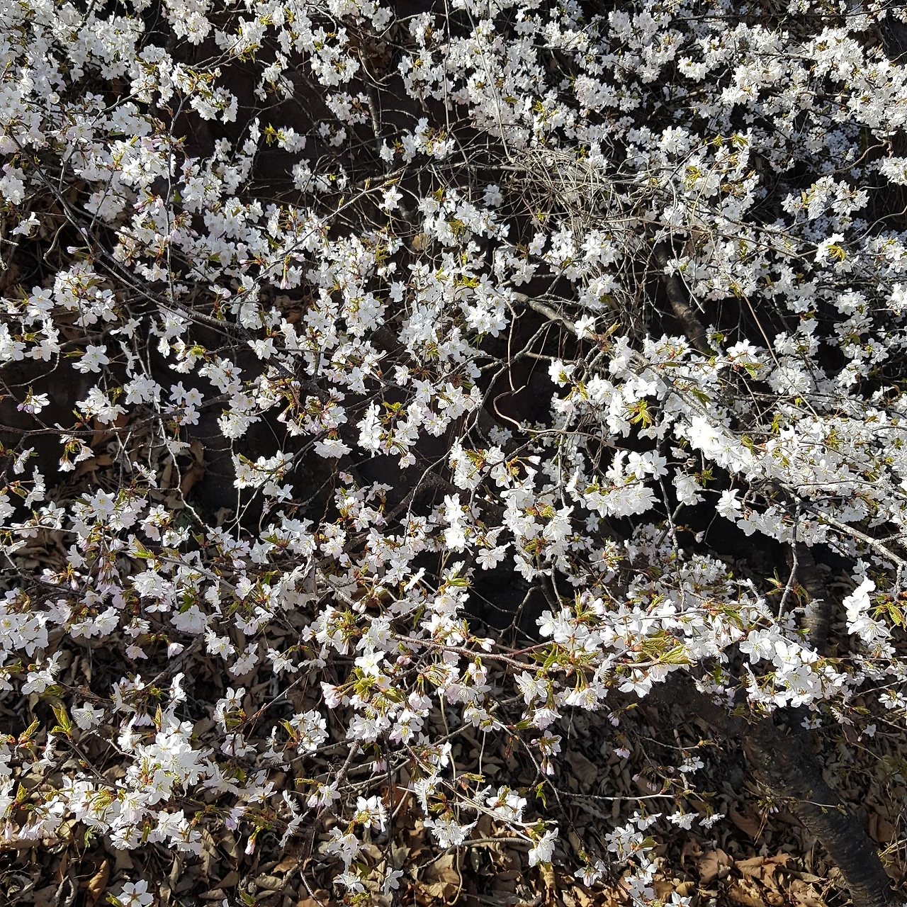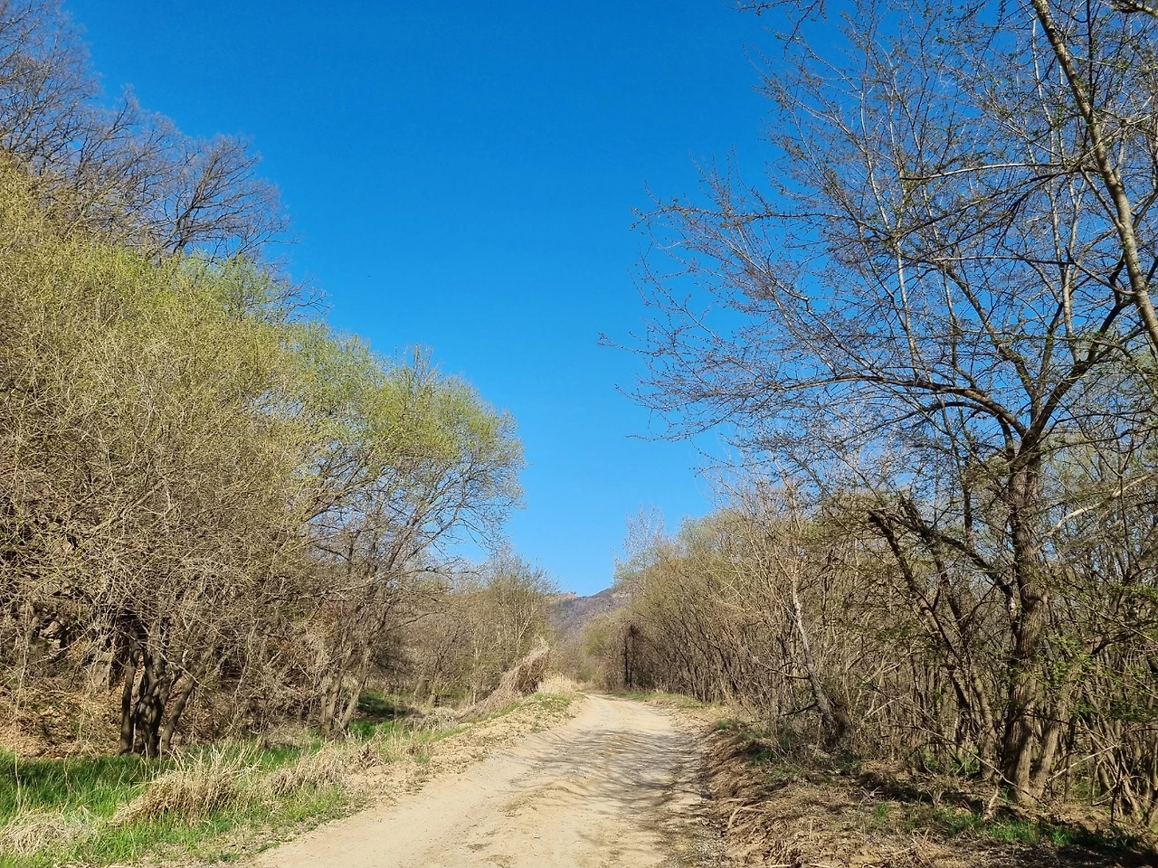 비가 오지 않아 강에는 물이 적었지만 연두색으로 살아나는 물가의 나무들이 하늘의 색과 벚꽃나무 가지와 어우러져 풍경화가 되었다.