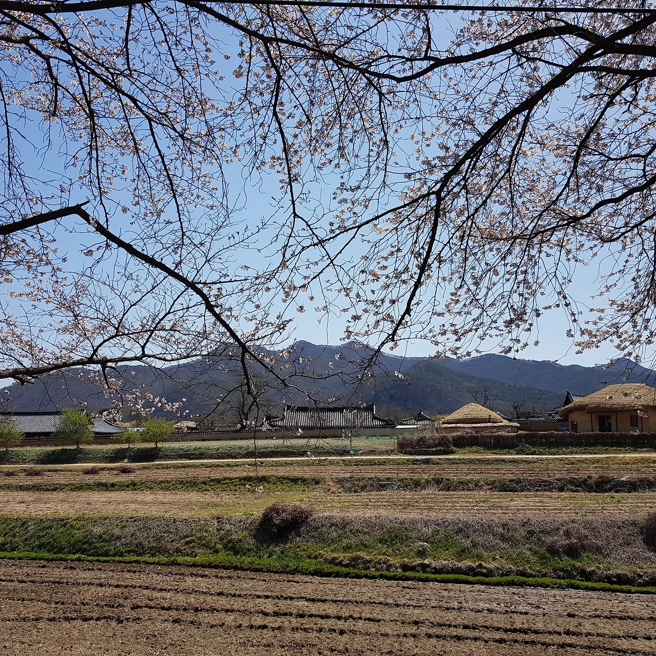 마악 피어나기 시작한 벚꽃가지 너머로 밭과 초가집과 기와집과 산, 그리고 길