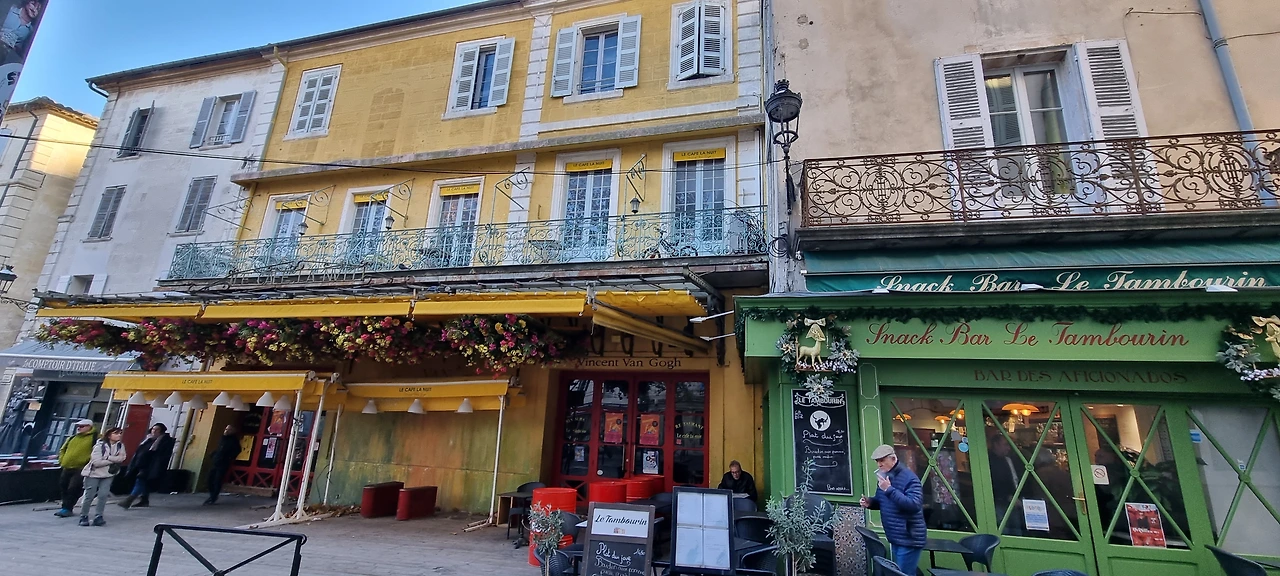 빈센트 반 고흐의 '밤의 카페테라스'의 배경. 카페는 문을 닫았고 천정에 있는 조화는 조악하고 창으로 들여다본 내부는 황량했다. 겨울이라 잠시 문을 닫은 것인지 안내문은 없었다. 방문객들은 문 앞을 서성이다 사진을 찍고 돌아선다. 바로 옆 초록색 카페에는 마을 사람들인듯한 사람들이 차를 마시고 있었다. 노란색 반 고흐 카페와 색을 맞추어 초록으로 가게를 단장한 감각 있는 주인장!