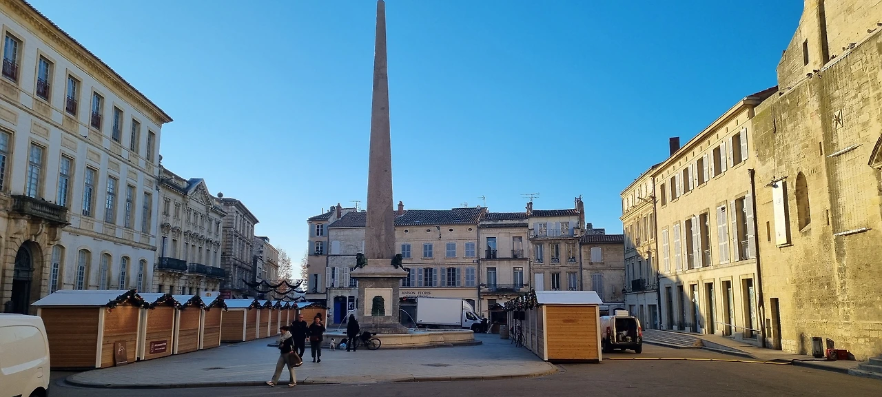 정면에 보이는 건물은 1673년에 지은 아를 시청이고 시청 지하에는 지하 회랑이 있다. 오른쪽 건물이 생 트로핌 다를 성당, 왼쪽은 생트안느 교회이다. 광장 중앙에는 커다란 오벨리스크가 있다.