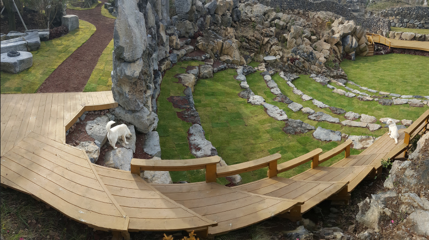 땅을 파다 큰 바위를 만나면 비켜나서 다시 땅을 파다 보니 바위와 바위사이 길이 생겼다. 파낸 흙으로 산을 쌓았고, 산 아래에 연못을 팠고 연못을 건너는 다리를 놨다.