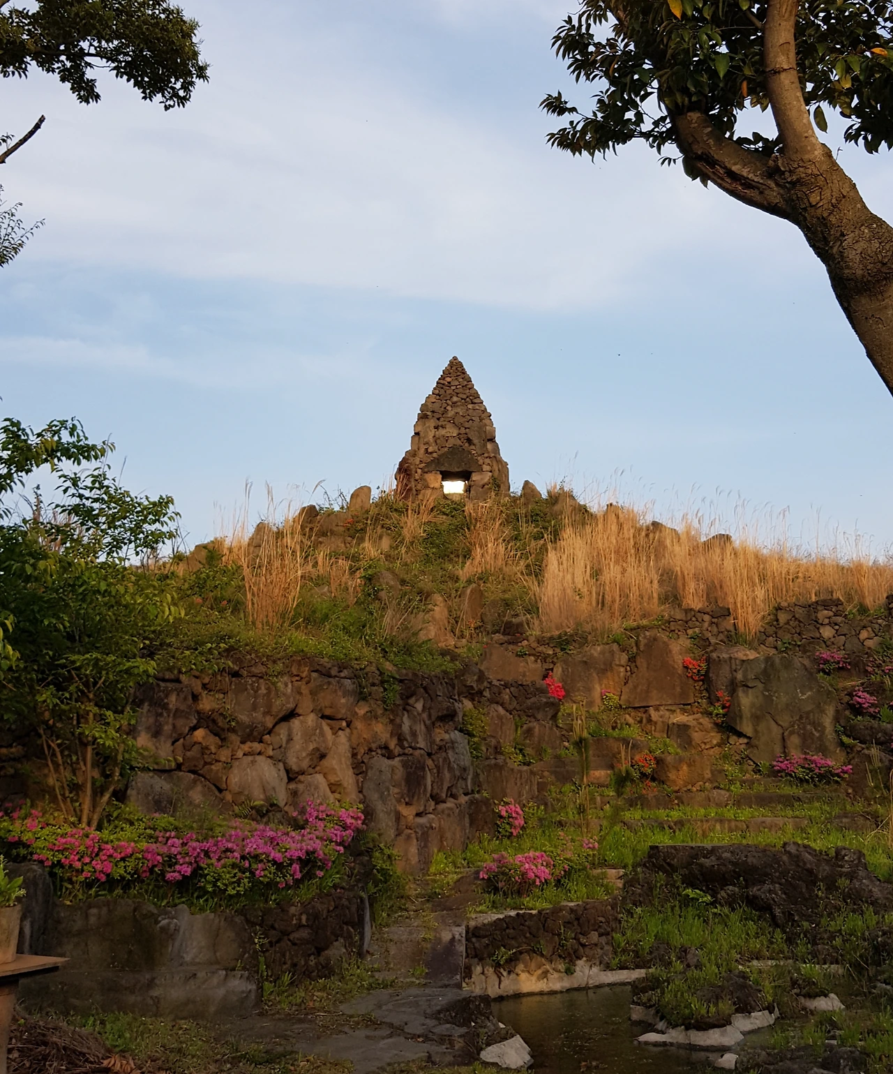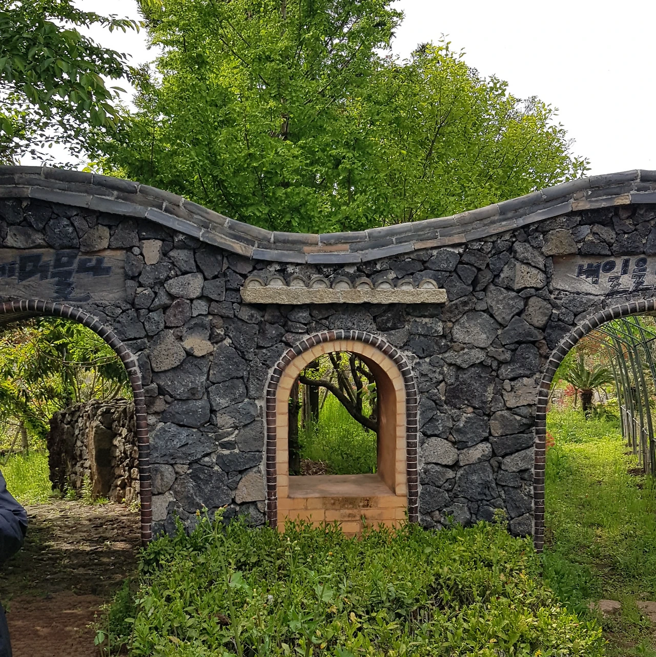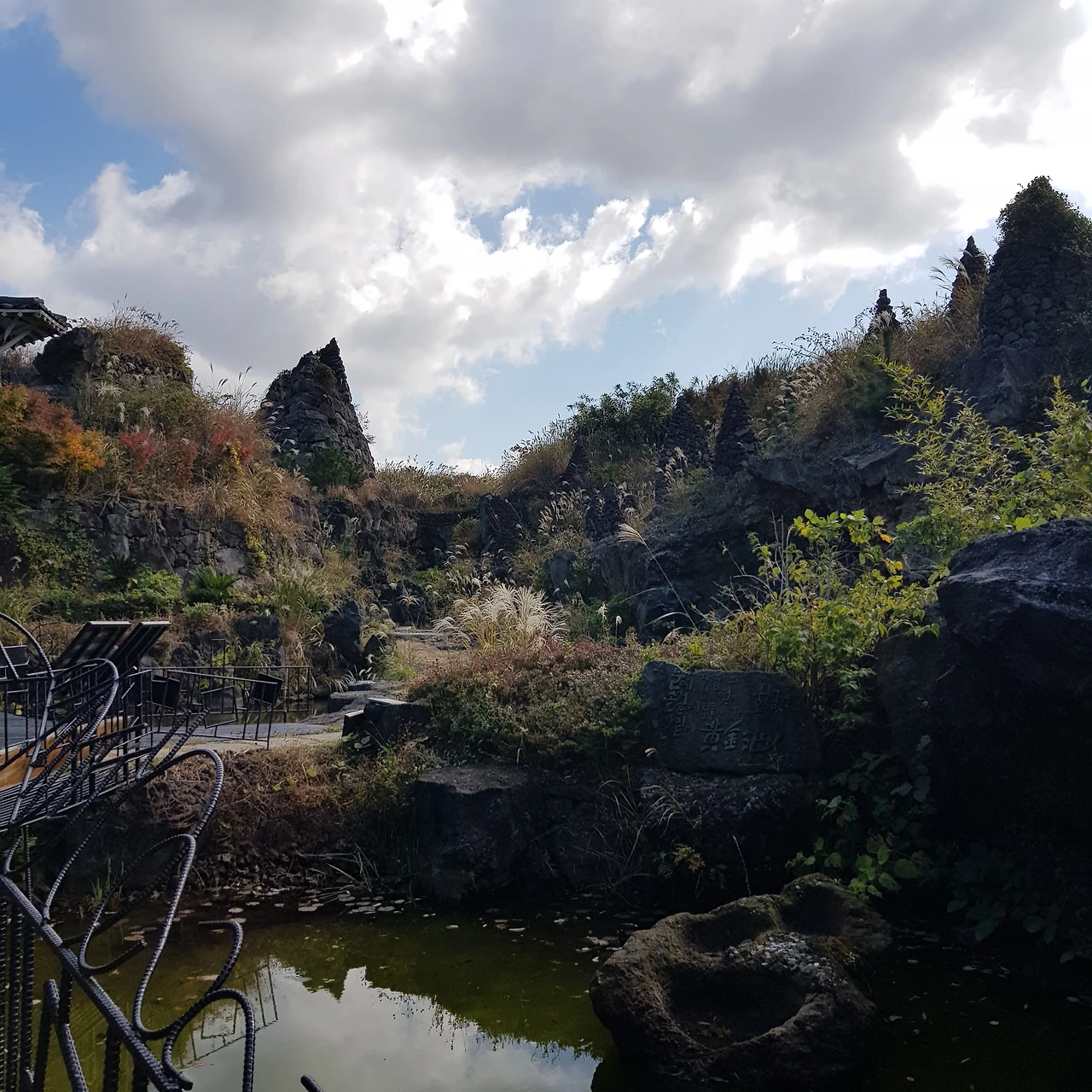 오랜 세월 동안 바위에 생긴 균열을 따라 돌을 들어내면서 길을 만들고 여기서 나온 돌로 담을 쌓았다. 안쪽에는 빗물을 모아 만든 연못인 억년 지를 끌어올려 폭포를 만들다. 이름은 '나이야 가라 폭포'