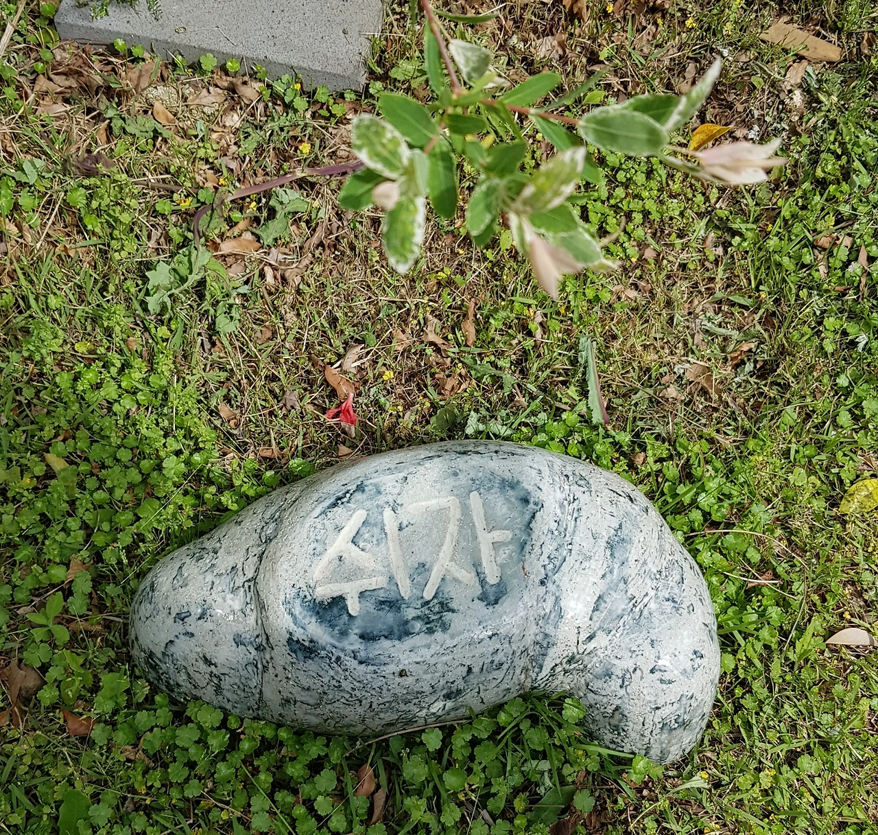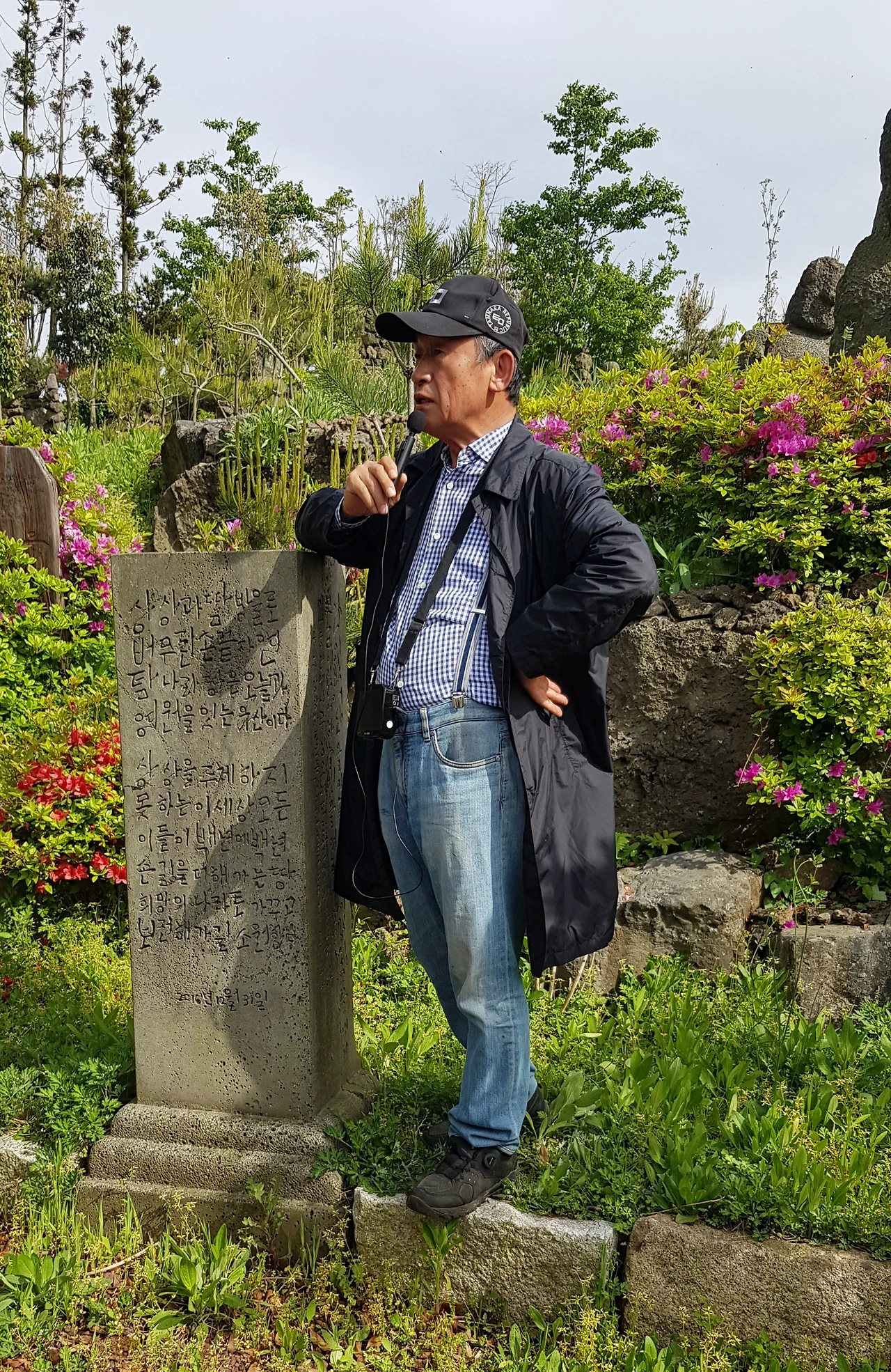 강우현 대표가 미리 만들어 놓은 자신의 묘비석 앞에서 설명을 하고 있다.