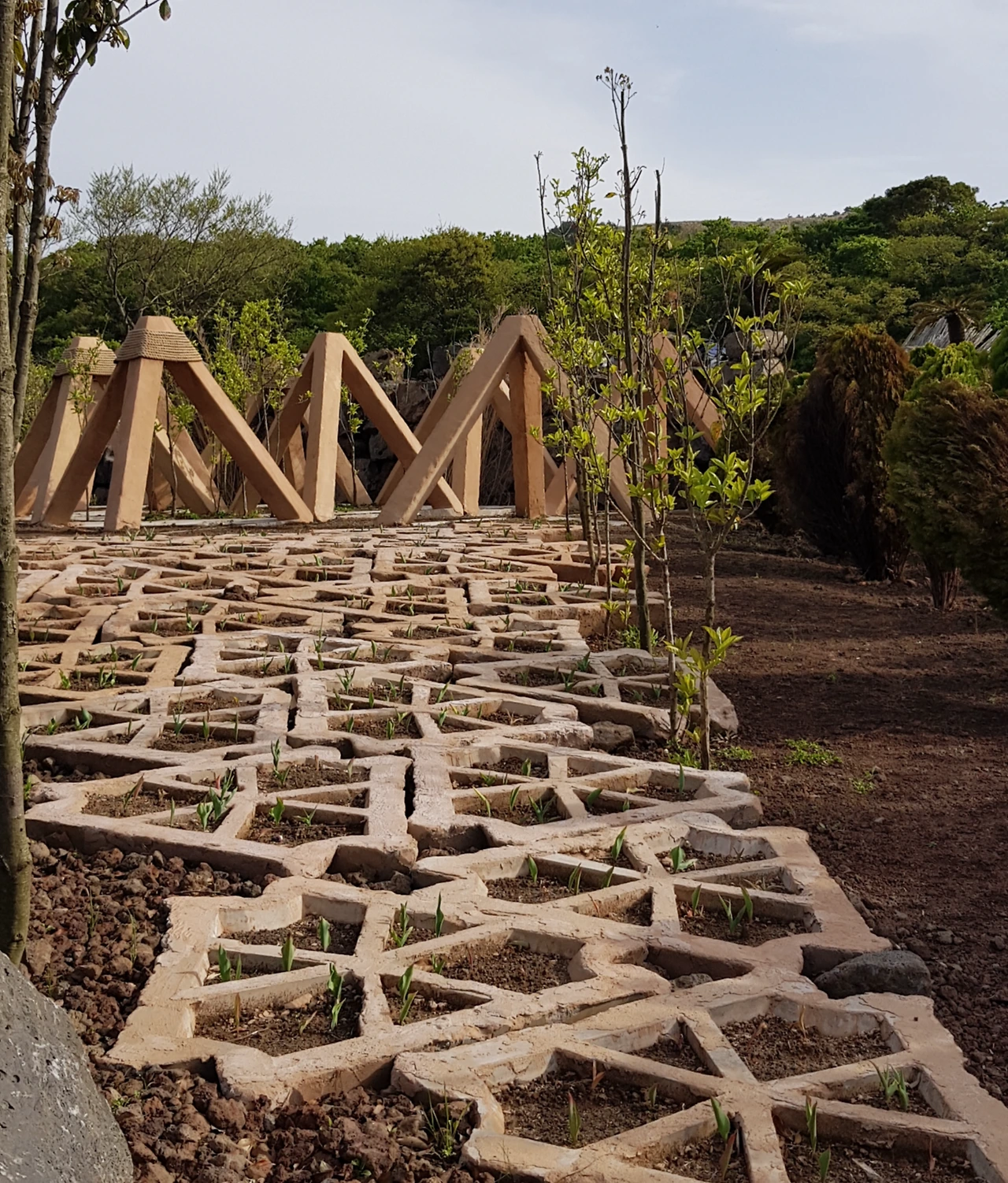 나무도 물도 없는 돌땅을 파서 나무를 심어 숲을 만들고 빗물을 받아 연못으로 만들었다.