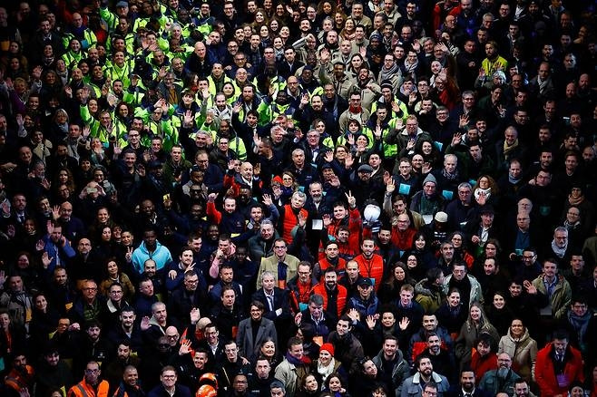 복구에 참여한 노동자들이 복원된 노트르담 성당을 방문한 마크롱 대통령을 향해 손을 흔드는 모습(사진출처:오마이뉴스 2024.11.29.)