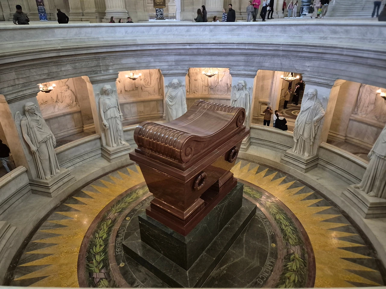나폴레옹은 유배를 갔던 영국령 세인트 헬레나 섬에서 숨을 거둔다. 20년 후 그의 유해는 프랑스로 돌아와 이곳에 안치되었다. 나폴레옹의 적갈색 관은 이 성당의 가장 가운데 자리에 있으며 일반 관과는 차원이 다른 크기를 자랑한다. 관 주변에는 나폴레옹이 치른 전투를 상징하는 12점의 승리의 여신 조각상이 있다.