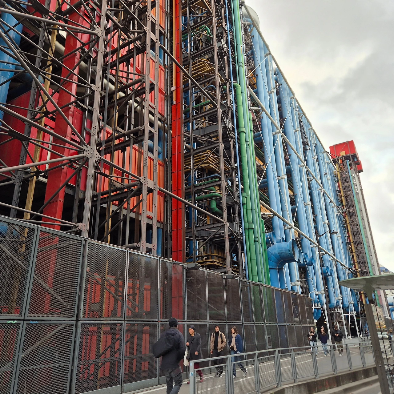 숙소로 돌아가기 위해 볼트를 불렀다. 볼트를 타기 위해 퐁피두 센터 뒤쪽으로 왔는데 앞쪽과는 완전히 다른 모습을 보았다. 1977년에 지었지만 48년이 지난 지금도 혁신적인 이 건축물의 뒷모습 역시 혁신적이었다. 기다란 색색의 파이프가 가득 채우고 있는 건물, 파이프 색깔로 기능을 구분한다고 한다. 파란색은 환기, 초록색은 수도, 노란색은 전기, 빨간색은 엘리베이터.
