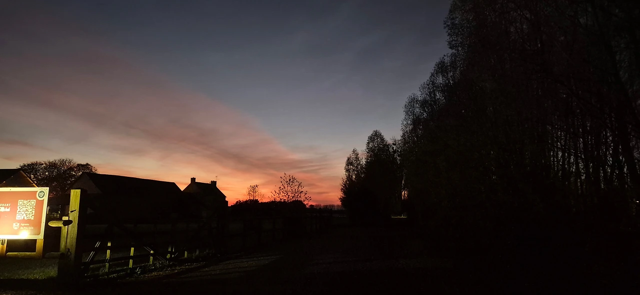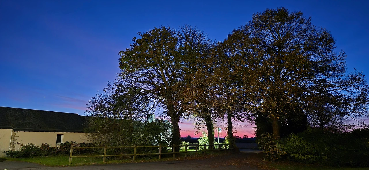 저녁식사를 위해 식당으로 가는 길, 다양한 색감의 노을이 나무 사이로 보인다. 몽생미셸에서 해가 지는 시간은 우리를 노을의 향연에 물들게 했다.