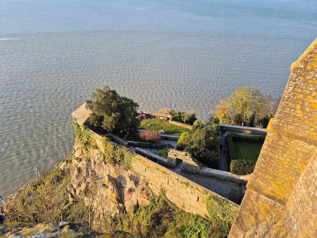 몽생미셸은 천 톤 이상 쌓아 올린 돌의 하중을 떠받치는 높은 아치와 굵은 기둥들의 대열이 나선형의 동선을 따라 늘어서 있다. 나선형 동선의 정점인 정원 옆 난간에서는 70m의 높이에서 노르망디의 광활한 갯벌과 지평선을 감상할 수 있다. 몽생미셸은 높이가 최대 80m에 이르며 독특한 자연 지형을 극복하고 적응하여 건설한 기술적 · 예술적 걸작이다.