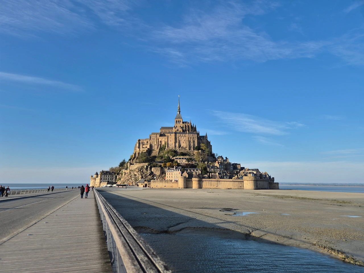 멀리 바다 위 거대한 돌을 뚫고 나온 듯한 몽생미셸 수도원이 보인다.