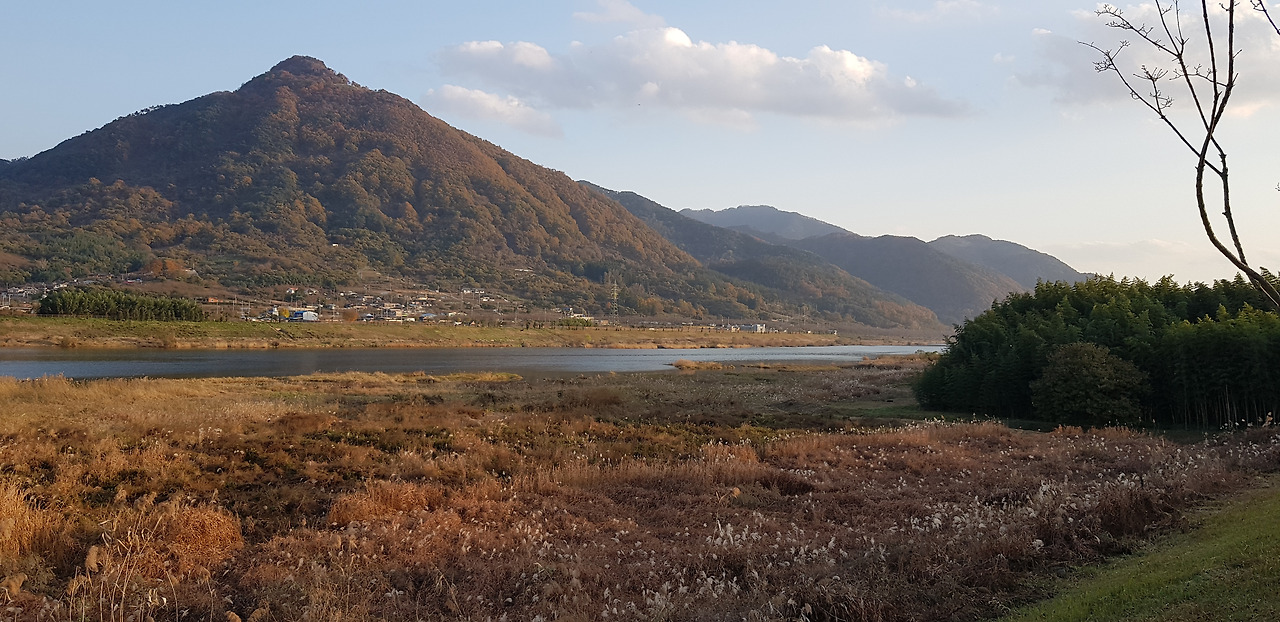 가을 석양빛이 산 머리를 비추고 있다.