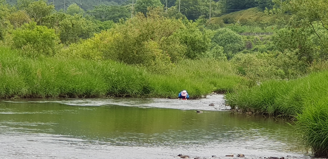 물에 발을 담그고 앉아 있으니 물 바람도 불고 조금씩 시원해진다. 멀리서 올갱이를 잡는 사람이 보인다. 물속을 계속 들여다보고 있는 모습이 멈춤 사진 같다. 더위에도 아랑곳하지 않고 우리가 그곳을 떠날 때까지 같은 자세였다.