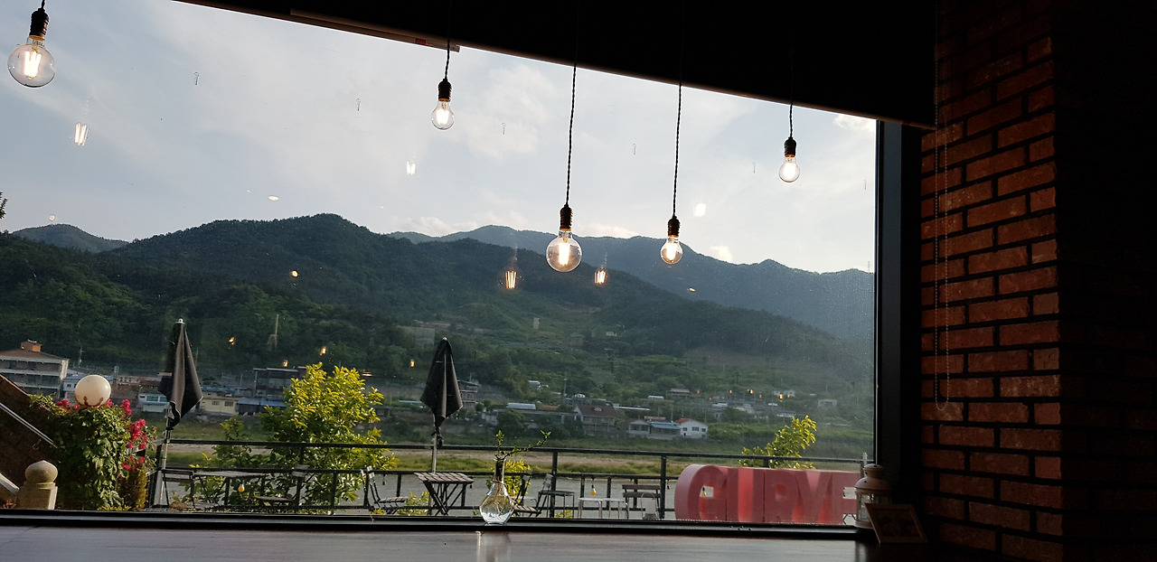 구례구역 근처에서 저녁을 먹고 기차 시간까지 카페에서 시간을 보냈다. 카페 창에 걸린 등과 바깥 풍경이 묘한 대조를 이루고 있다.