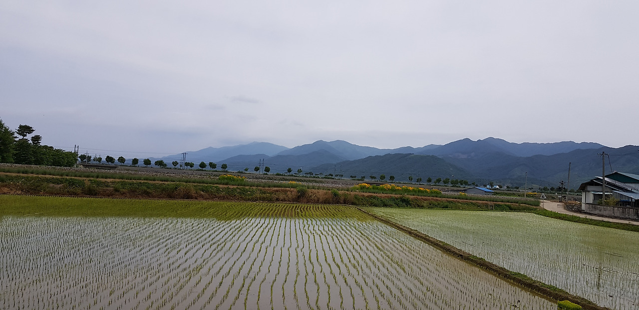 물 댄 논에 심어 놓은 모가 하늘과 산과 나무와 어우러져 아름답다.