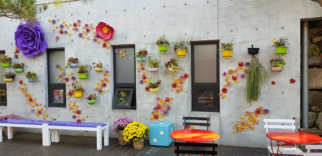들어설 때 좋다. 덤덤한 시멘트 벽에 화사한 꽃과 식물, 환영받는 느낌이 든다.