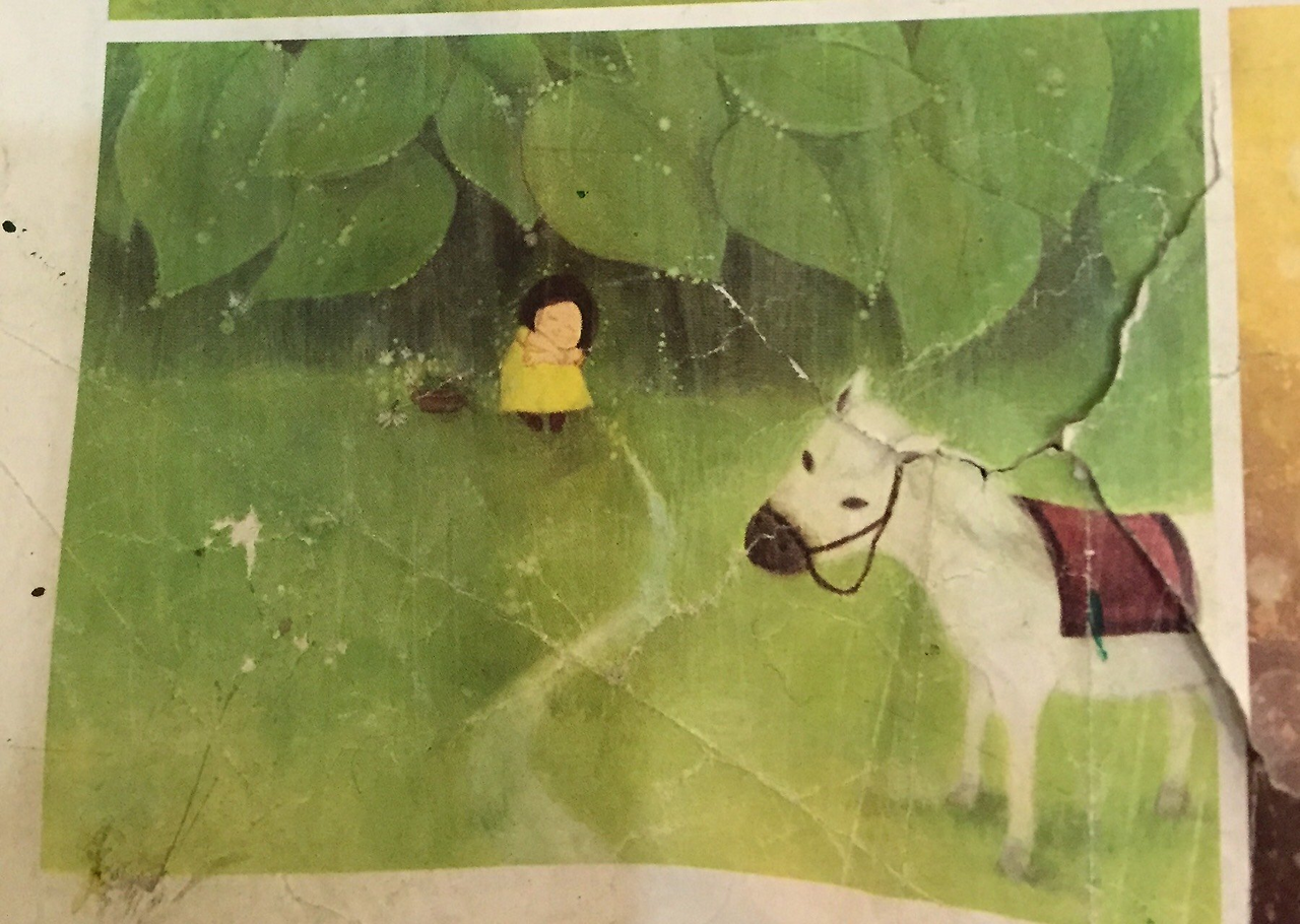 원본이었던 일러스트 책 속 그림에는 오른쪽 아래에 하얀 말 한 마리가 비를 맞으며 서 있었다. 그런데 나는 말을 그리지 않았다. 정확히는 그리지 않은 것이 아니라, 그리지 못한 것이긴 하지만. 비를 피하는 아이보다 앞에 배치되어 있어서 원근감에 따라 하얀 백마를 큼지막하게 그려 넣는 것이 너무 어려워 보였다. 작은 아이는 흉내라도 낼 수 있을 것 같은데 말은 도무지 자신이 없었다. 더 크게, 더 자세히, 더 잘 그릴 수 있는 자신이 없었던 것이다. 그래서 말을 과감히 생략하기로 했다. 그러자 선생님은
