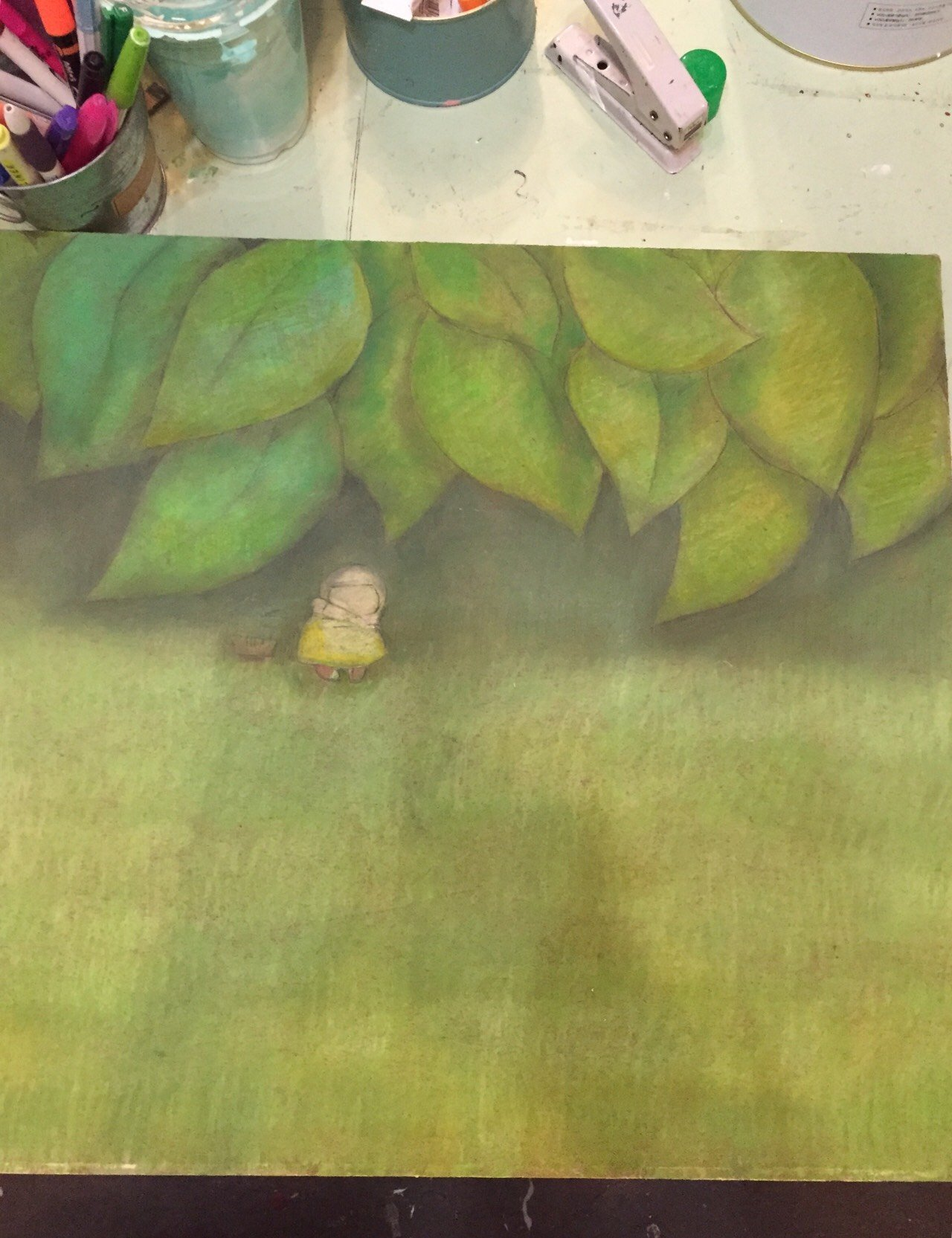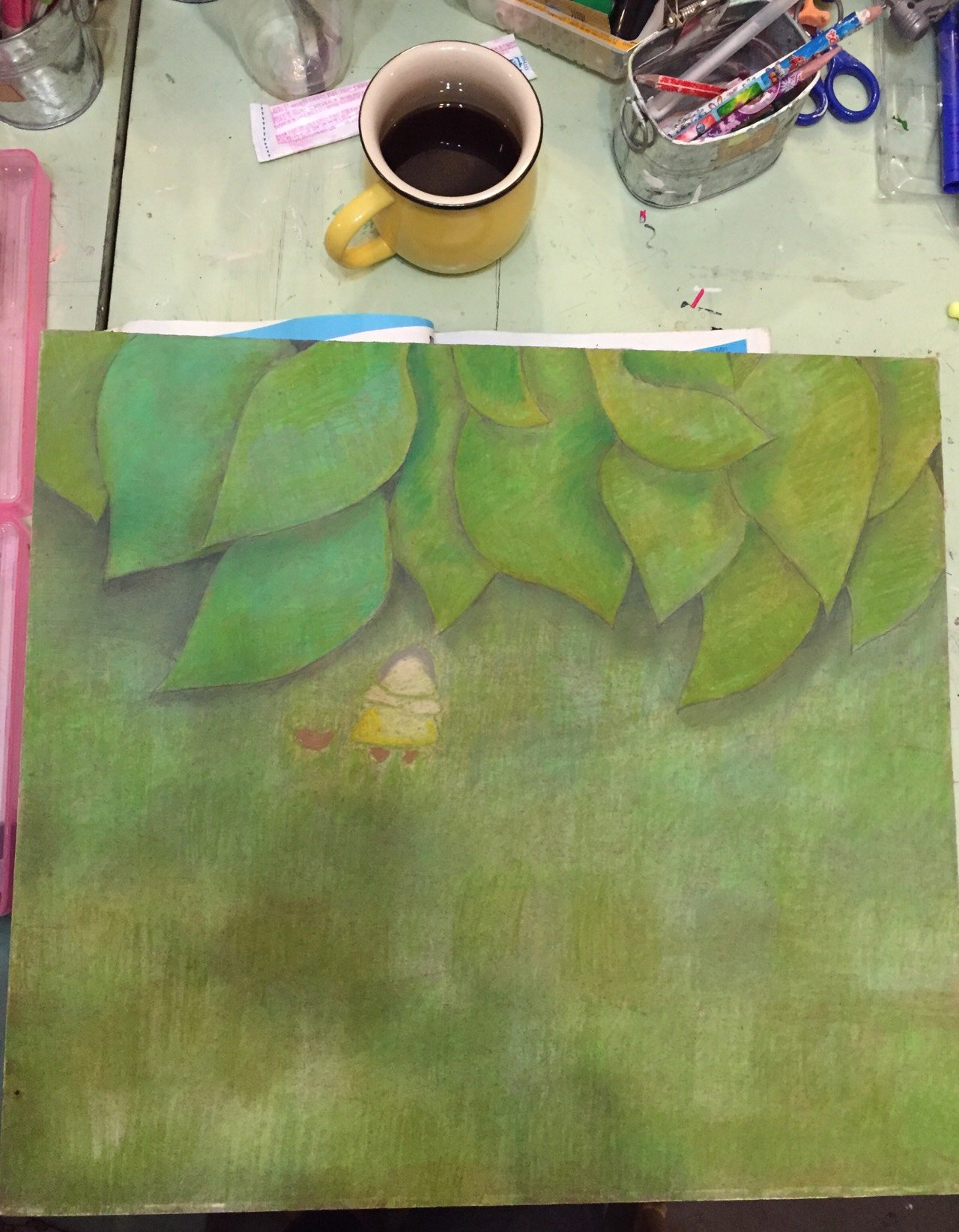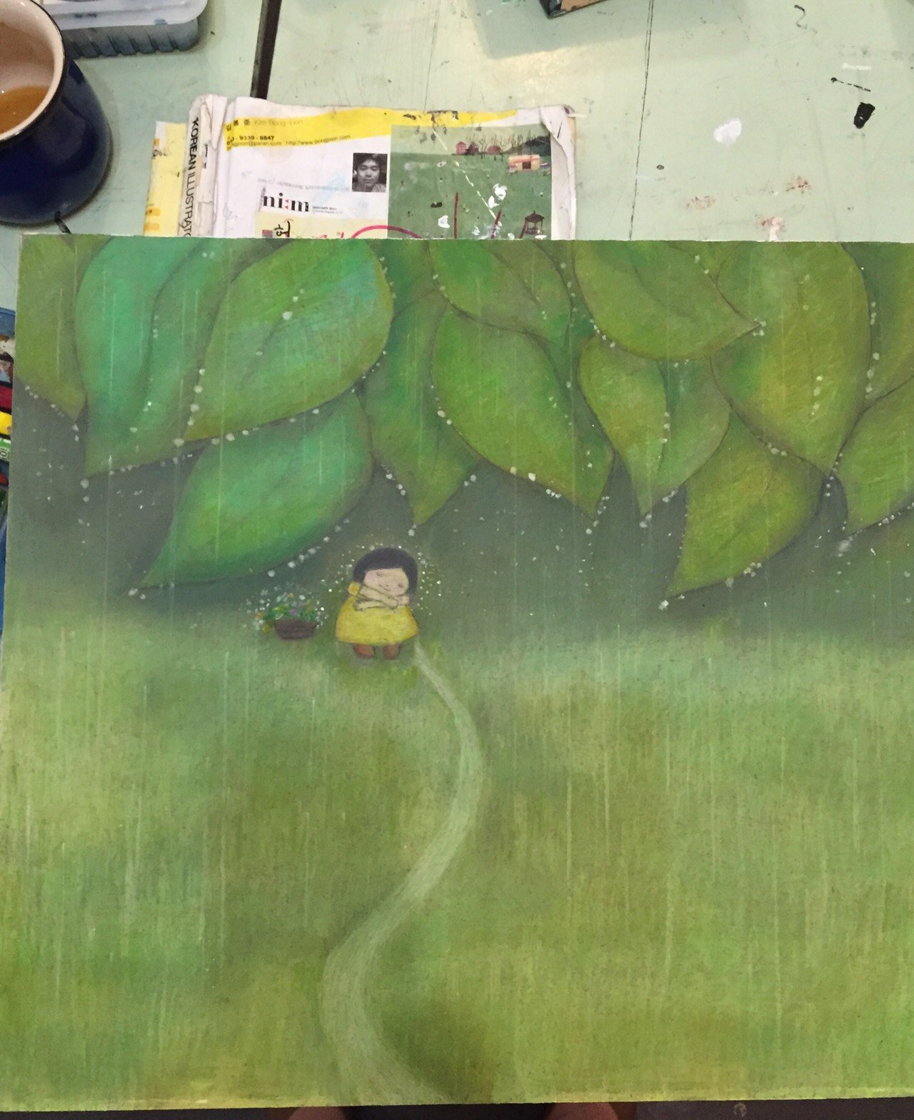 혼자 카페 화실을 독차지한 채 2주 전에 시작한 작업을 이어서 해나갔다. 화면 가득 초록이 짙어서 눈이 편안하고, 비가 내리고 있어 시원함도 느껴지는 장면이었다. 그림을 고를 때, 초록 나무 아래 아이의 표정이 좋은 꿈이라고 꾸는 듯 편안해서 저절로 미소가 지어졌었다. 오랜만에 크레파스화를 고른 것도 여름이라서 이유가 한몫했는데, 밑작업 하는 시간이 별로 오래 걸리지 않을 것이라 생각했기 때문이다. 실제로 지금까지 했었던 크레파스화 중에서 제일 큰 사이즈였음에도 힘이 훨씬 덜 들었다. 모처럼 크레파스화 작업을 하는 것이라 새롭기도 하고, 전보다 수월하니 재미있었다.