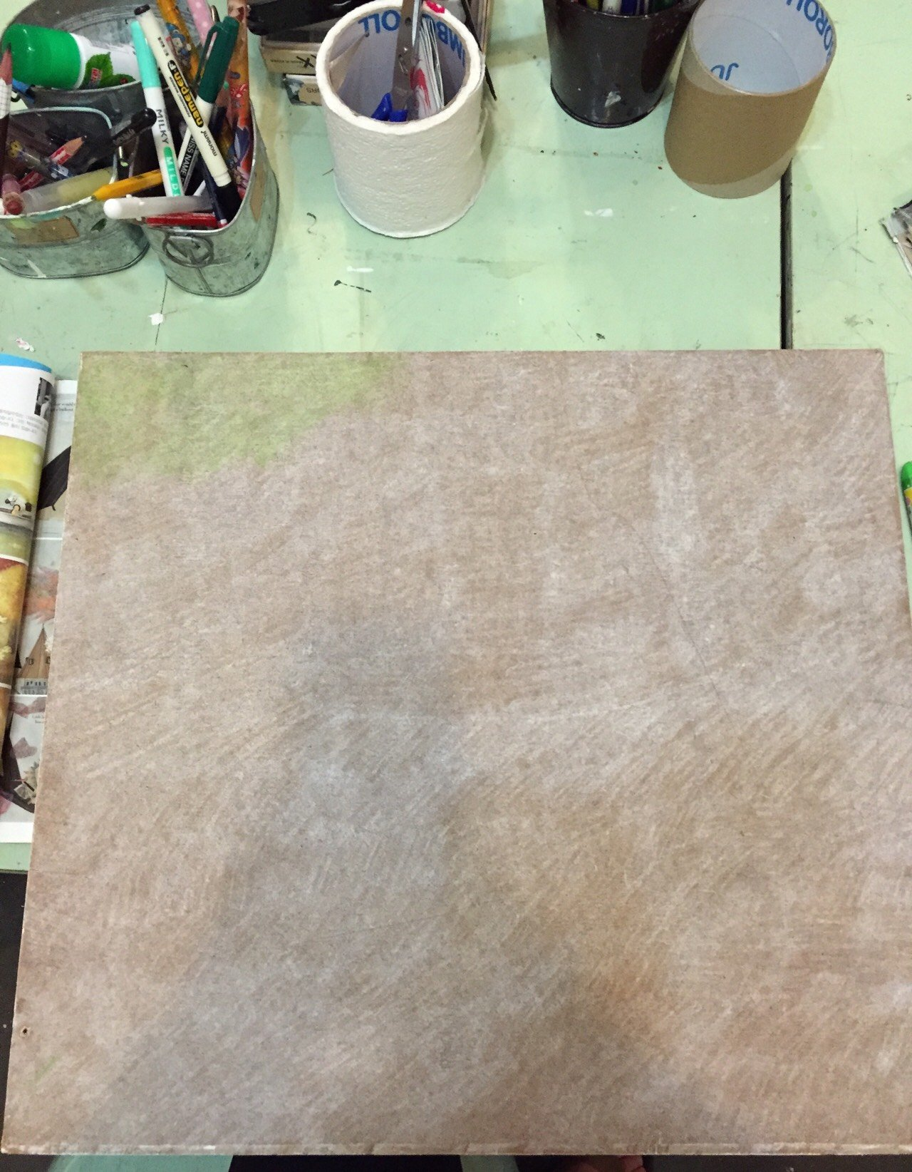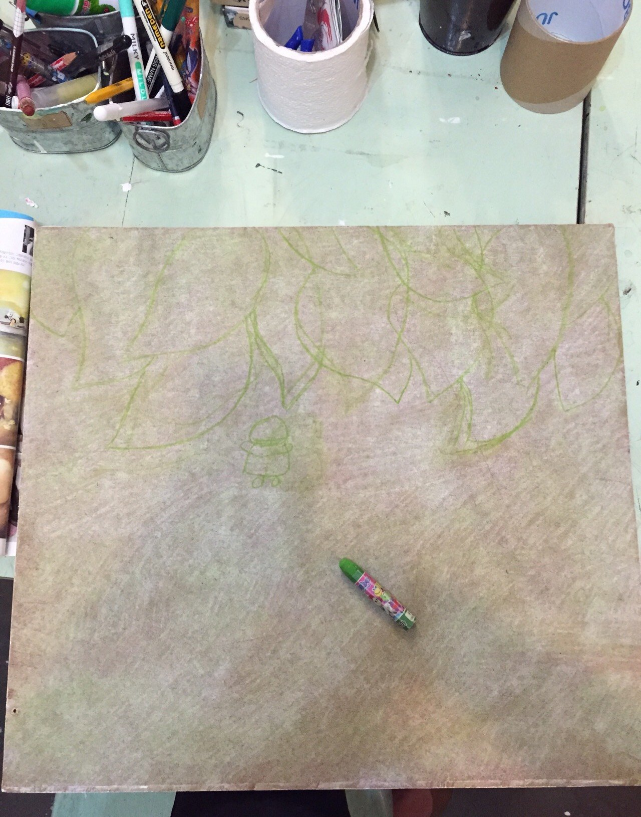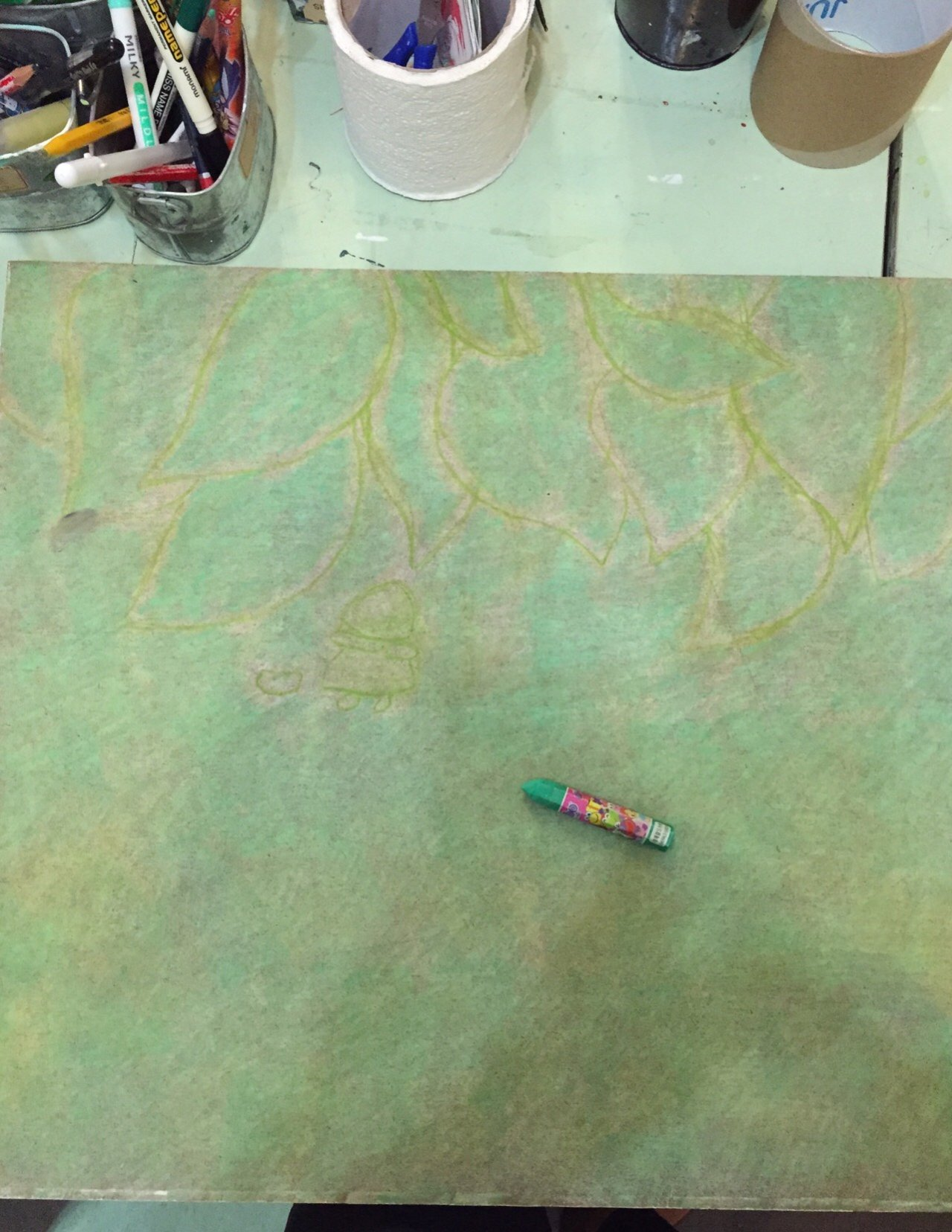 혼자 카페 화실을 독차지한 채 2주 전에 시작한 작업을 이어서 해나갔다. 화면 가득 초록이 짙어서 눈이 편안하고, 비가 내리고 있어 시원함도 느껴지는 장면이었다. 그림을 고를 때, 초록 나무 아래 아이의 표정이 좋은 꿈이라고 꾸는 듯 편안해서 저절로 미소가 지어졌었다. 오랜만에 크레파스화를 고른 것도 여름이라서 이유가 한몫했는데, 밑작업 하는 시간이 별로 오래 걸리지 않을 것이라 생각했기 때문이다. 실제로 지금까지 했었던 크레파스화 중에서 제일 큰 사이즈였음에도 힘이 훨씬 덜 들었다. 모처럼 크레파스화 작업을 하는 것이라 새롭기도 하고, 전보다 수월하니 재미있었다.