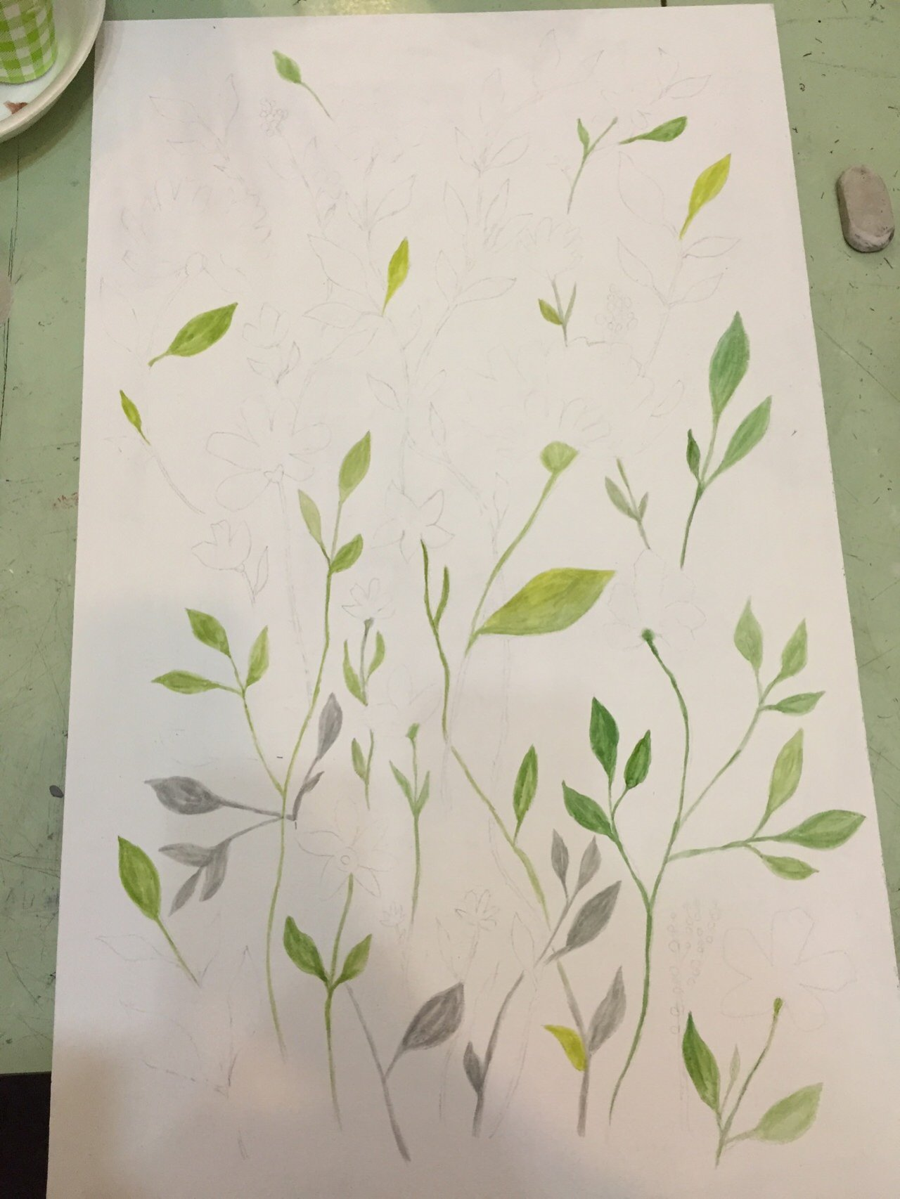다음에는 하얗게 만든 배경 위로 이파리들을 그려 나갔다. 얼핏 보면 크기와 모양이 비슷한 것 같았지만 모두 조금씩 달랐다. 줄기를 뚫고 나온 지 얼마 되지 않은 아기 이파리도 있고, 꽤 널찍한 이파리도 있었다. 색감은 더 다채로웠다. 초록색이라고 해도 연초록, 밝은 초록, 짙은 초록, 밝은 올리브, 짙은 올리브, 딥그린... 기본 물감에 들어 있는 초록색 계열만도 여러 개였는데, 다른 색과 섞으니 이름을 붙이기도 어려운 초록 빛깔이 만들어졌다. 이름을 붙인다는 것이 어떤 면에서는 정체성을 부여하는 것이기도 하지만, 명명하고 한정할 수 있는 언어가 얼마나 제한적이고 빈약한 것인지 조색을 하면서 알았다. 물론 그런 제한과 빈약함 속에서도 정체성을 얻은 색들은 축하할 일이지만.