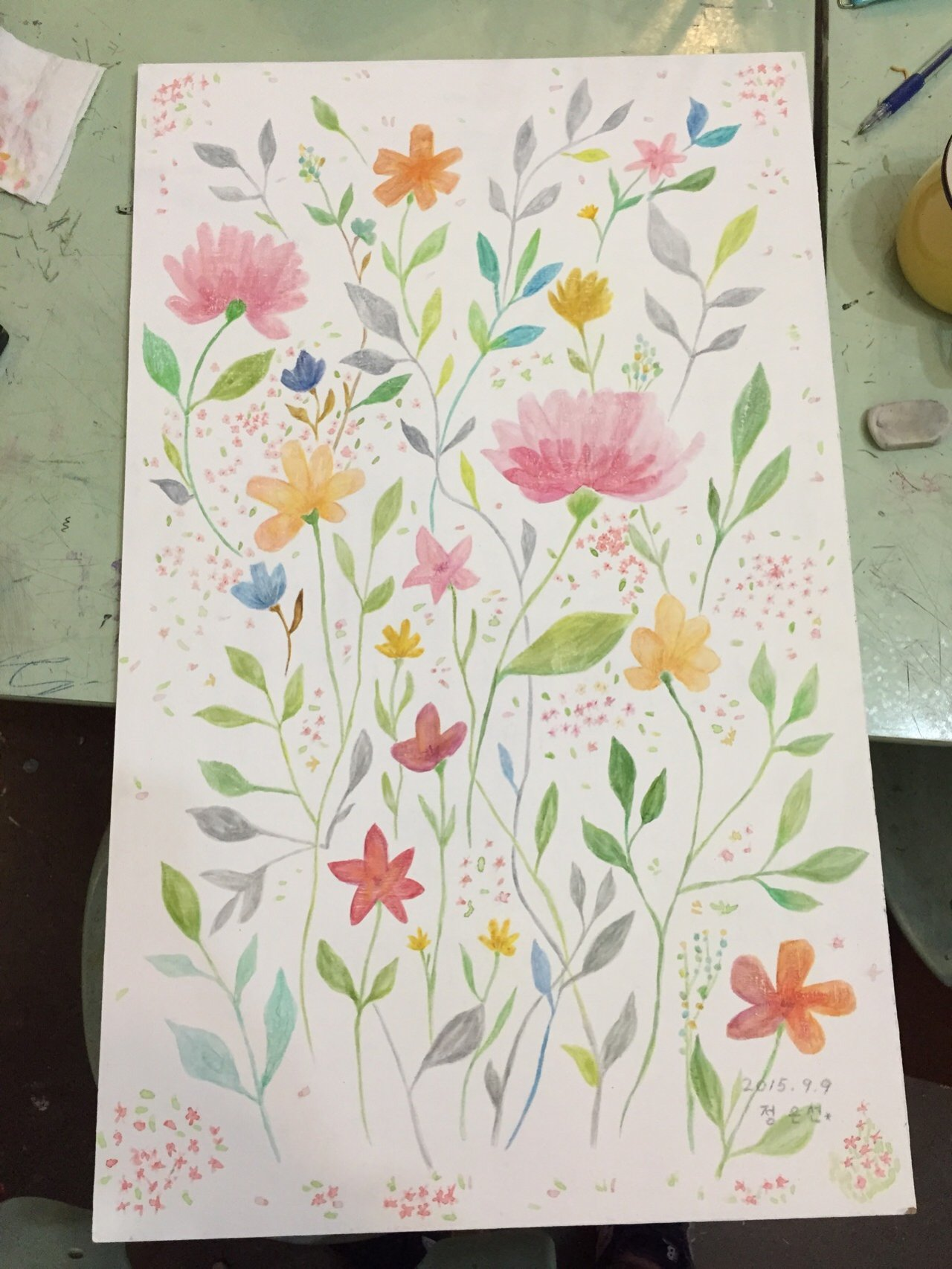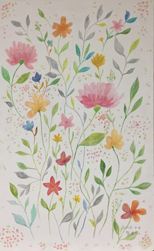 꽃들도 마찬가지였다. 이파리들과는 다른 화려함을 서로 다른 모양과 빛깔을 통해 뽐내고 있었다. 원본 이미지 속 꽃들의 화려함은 주저 없이 색깔을 드러내는 자신감에서 나왔다. 꽃잎 하나에도 수줍음 같은 옅은 빛깔과 대담한 강렬함이 섞여 있었다. 수줍은 분홍빛, 열정 같은 다홍빛, 개성 있는 청포빛이 어우러졌다. 나의 채색은 넘치는 자신감도 아니고 능숙한 노련함도 아니었지만. 비록 원작이 갖는 당당함까지는 기대할 수 없더라도 발랄함은 살리고 싶었다. 다행히 완성해 놓고 보니 전체적으로 산뜻함이 느껴졌다.